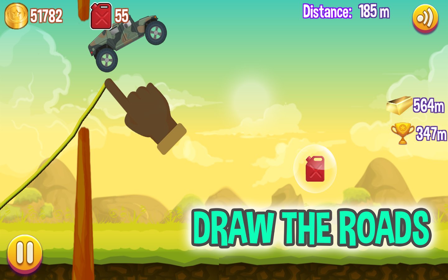 Road Draw - Hill Climb Race – game for Android where you will draw the road for a moving car. The aim of the game is very simple you need to draw with your finger the street and hold the car on most long distance. Avoid the path of all obstacles and impediments, and do not forget to collect gold coins and fuel tanks. Try to avoid vehicle collisions with obstacles and do not break the road. Complete all game missions and unlock new cars, which will delight you with a unique view. Move through different locations and enjoy the realistic physics.
