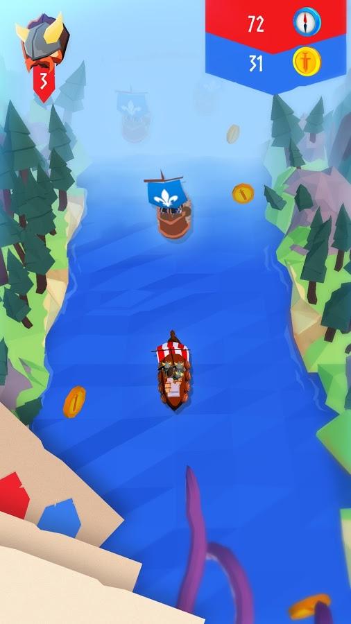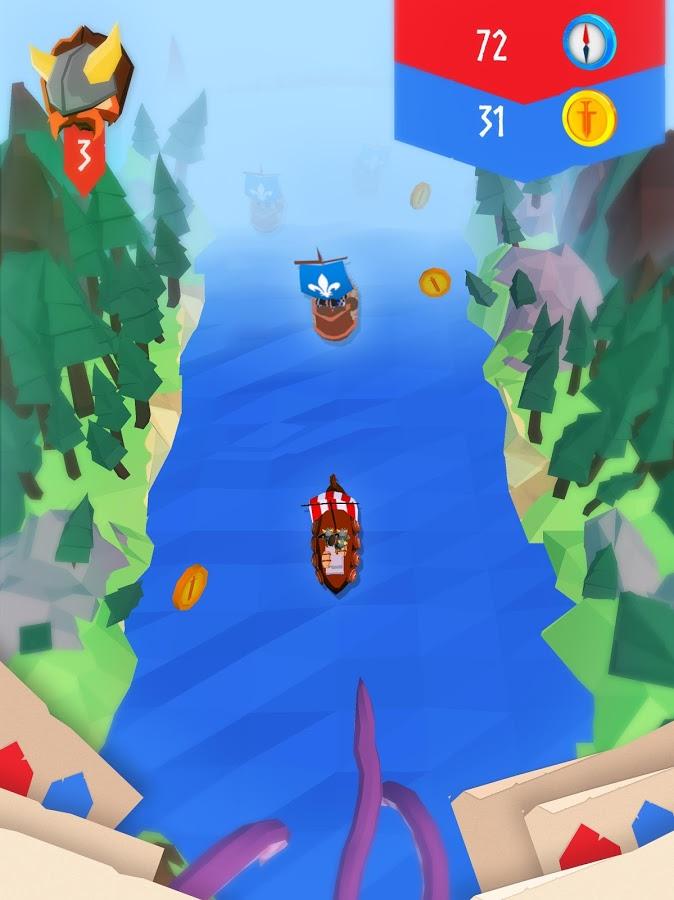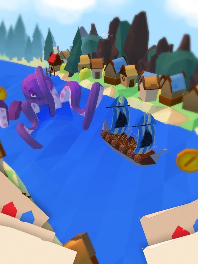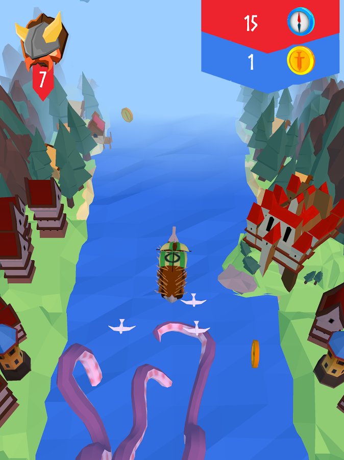 Viking Sail – a game on Android where you will help the brave Viking to travel in a ruthless land. Fly your ship in front and blow into the sails as much as possible, to quickly go through all the obstacles and escape from a giant octopus chasing you. During this fascinating journey you will encounter many obstacles on your way and in order to avoid them you need to put a lot of effort and try to gain maximum speed. Survive as long as possible in this game and collect the path of all the bonuses to your ship. Help the Vikings navigate their way safely home.