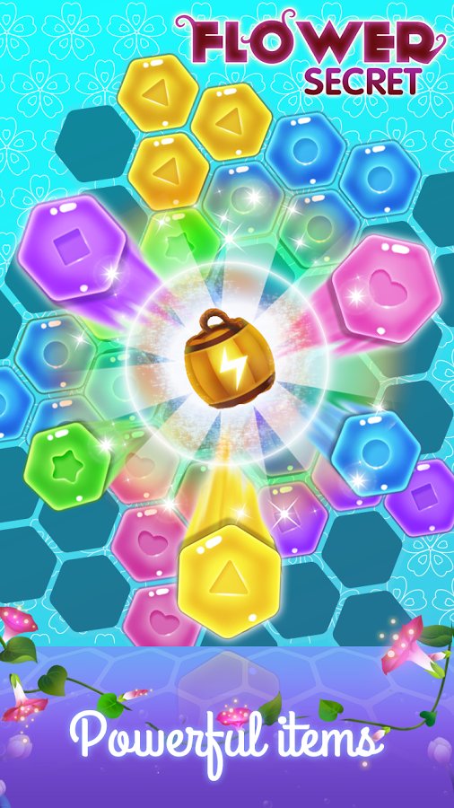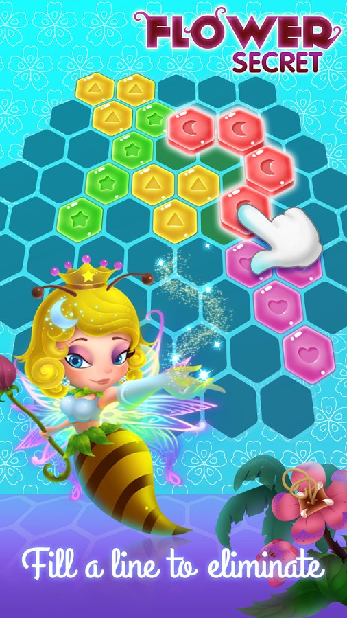 Flower Secret - Hexa block puzzle & eliminate Gems – a game on Android where you will help the bee to fill the cell. In this weight you will go on an exciting journey where you will meet different characters and do all their logical and mental abilities to pass the level. Place on a playing field composed of hexagons, a variety of shapes and try to make the figures completely filled row and then it will disappear and you will get extra points. Train your wits and arrange the pieces in the right places. The game features over 300 levels, lots of bonuses and power-UPS.