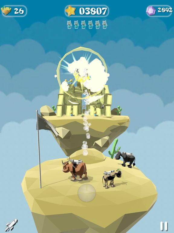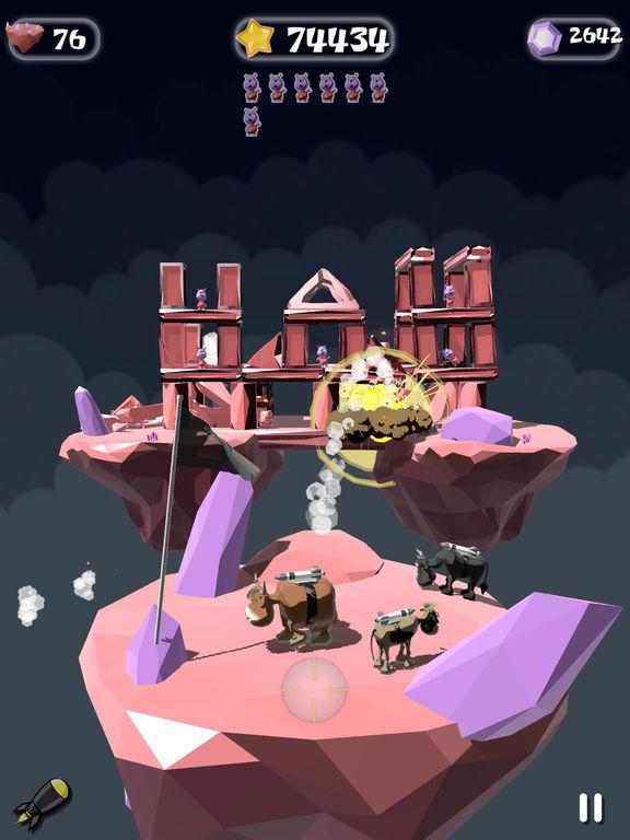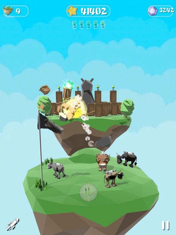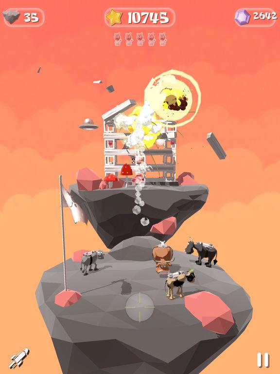 Rocket Cows – a fun game for IOS where you will destroy alien island and UFOs. The game s plot begins with the fact that the evil aliens came to your planet and have kidnapped the Princess all the cows and now they will take revenge. Aim and shoot the cows to the maximum to destroy all the Islands of the aliens and show who is the boss. Ahead of you are 80 unique and diverse levels of complexity will grow exponentially. Discover 8 powerful missiles and destroy all the blocks on the Islands of the aliens. Show all his accuracy in this game and achieve excellent results.