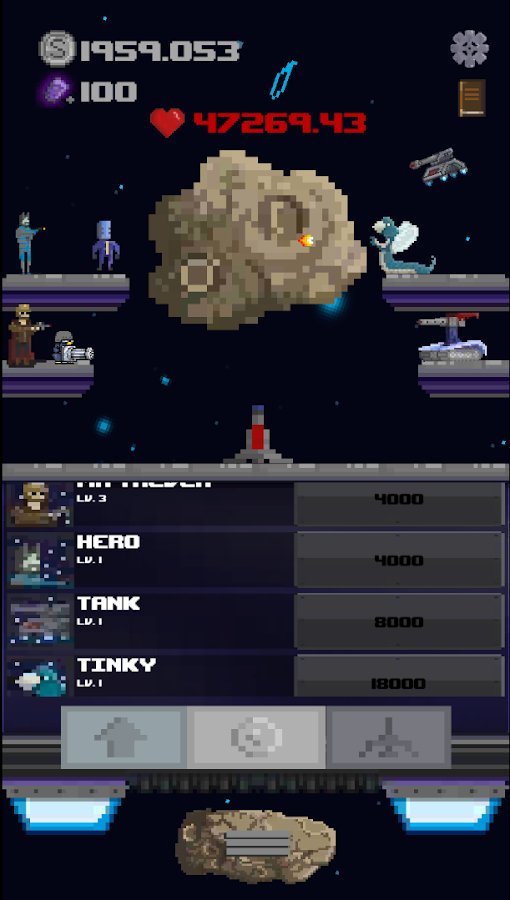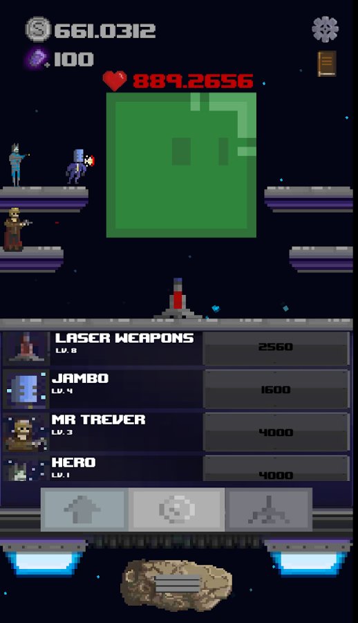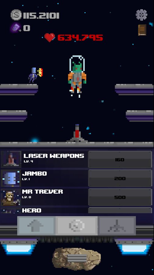 Space Savior – role-playing game on Android, in the genre of the game where you will help the astronauts to destroy the monsters. This pixel game will take you into space, where your task is to click on the screen of your device as often as possible in order to destroy all hostile creatures who want to capture your planet. Command a StarShip spacecraft and help the astronauts to defeat monsters, and other space beings who have taken your side and fight against monsters. Upgrade and improve your ship.