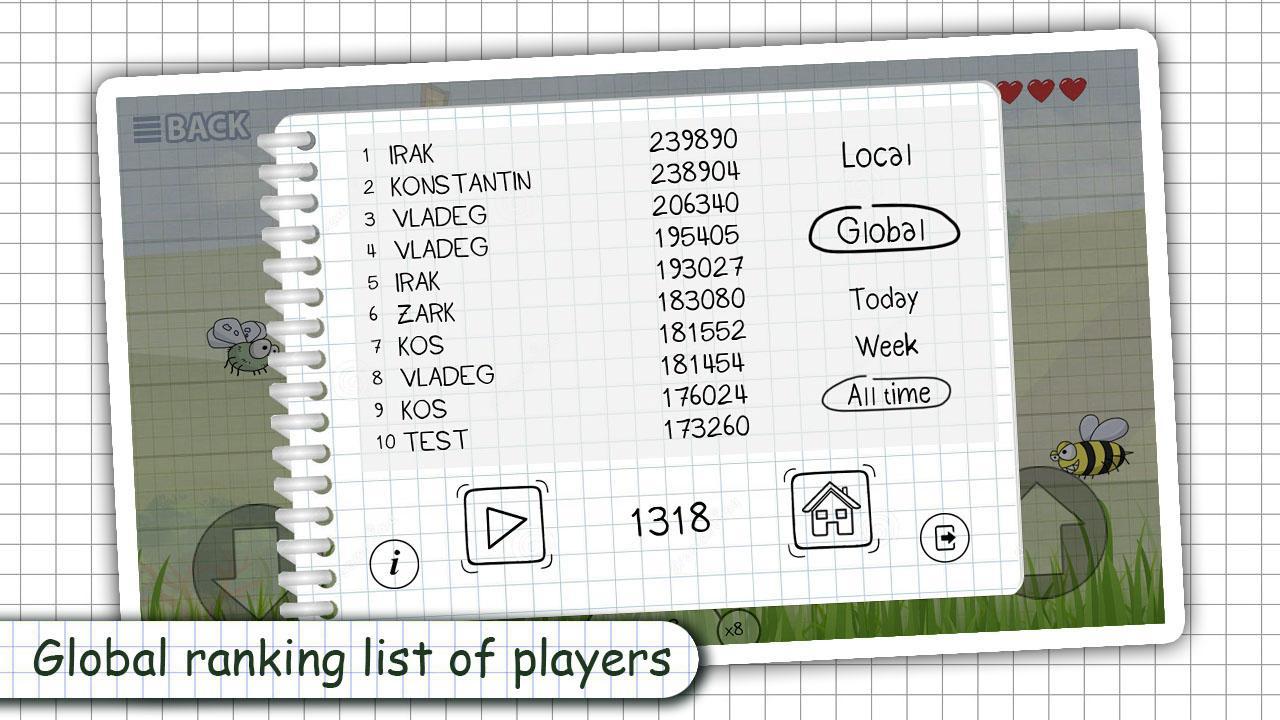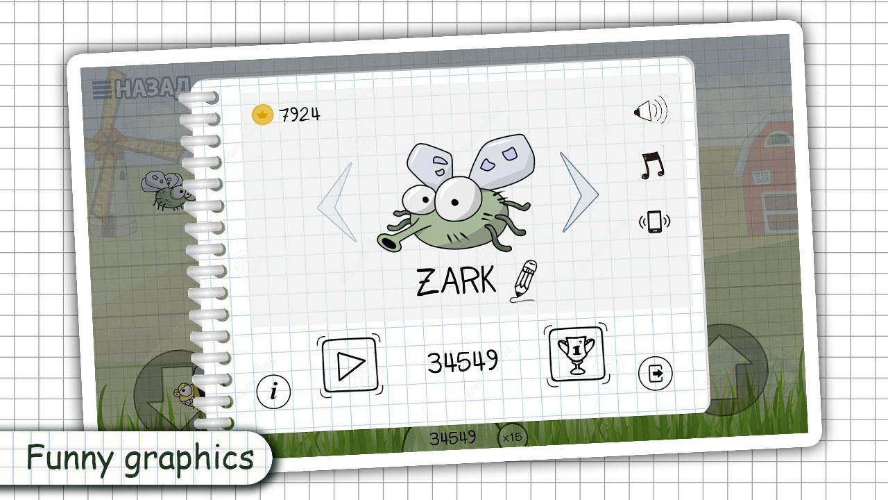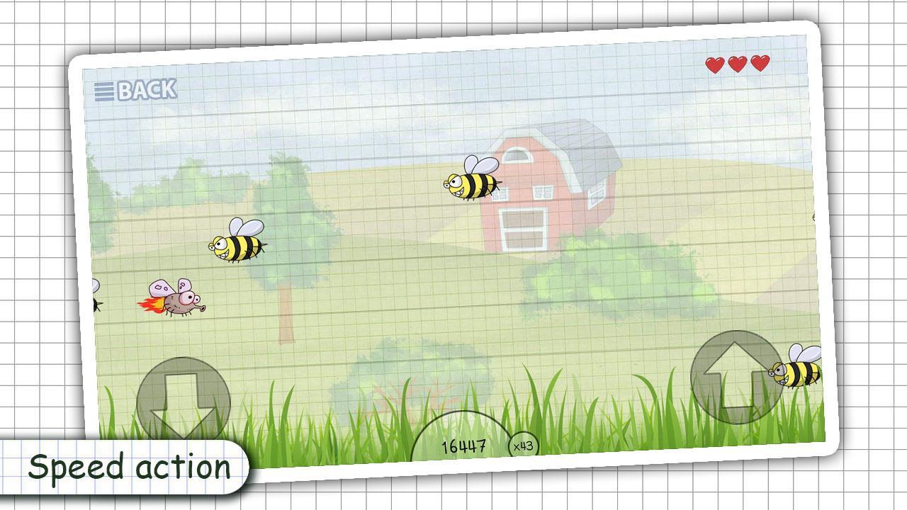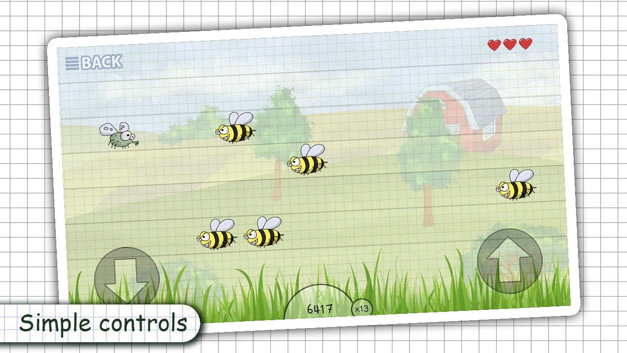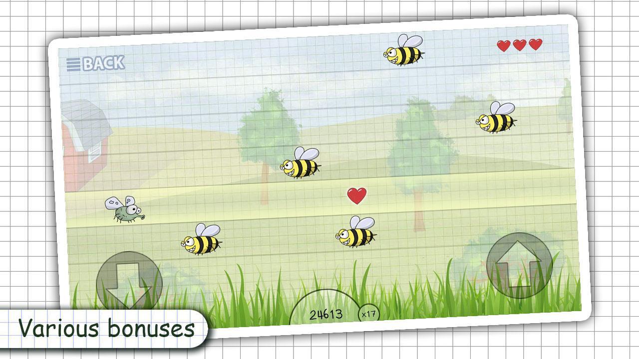 Doodle Fly - Bee Attack – an entertaining game where you control a fly. In this game you will find yourself in the cartoon world, where you take control of your fly and hold it through various locations filled with dangerous bees. Guide fly forward, moving it from side to side and avoiding collisions with the bees and do not forget to collect bonuses and score points. Walk as much as possible the way in the game and set your highscore, compete with friends and other players. Earn maximum points and discover the many skins for the hero.