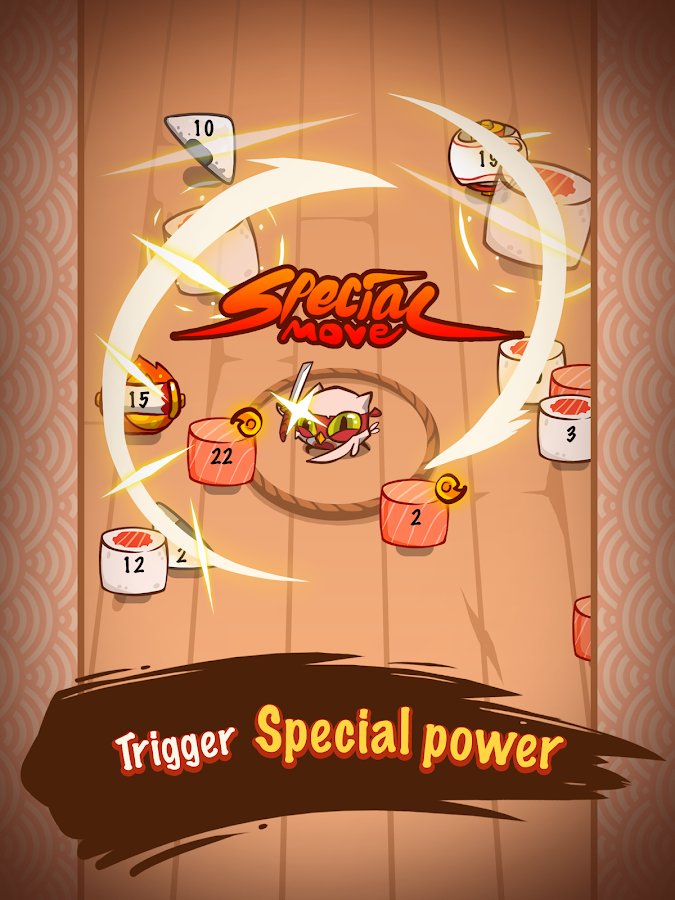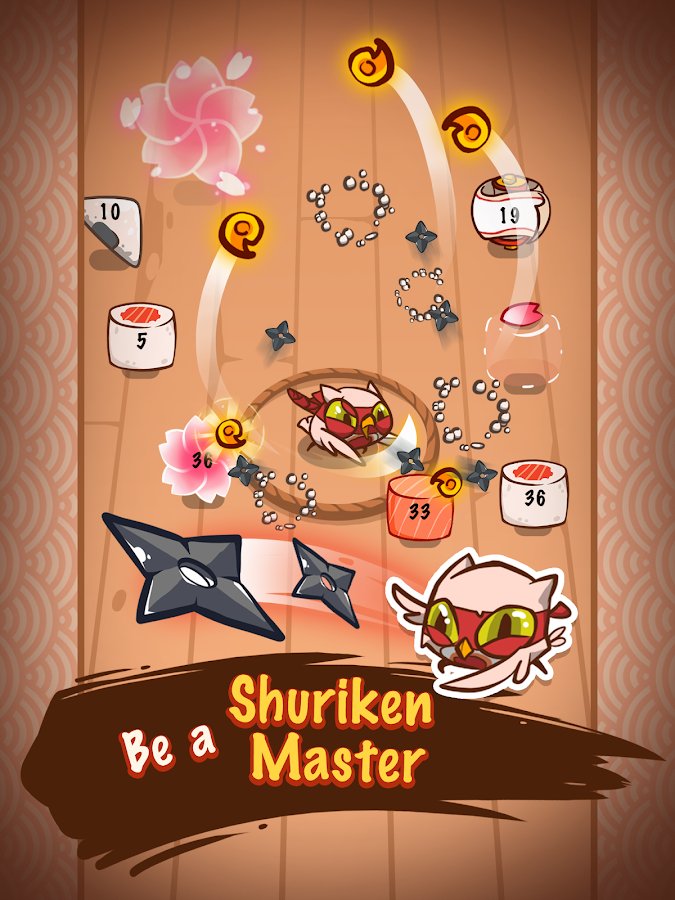 Shuriken Master! – dynamic arcade game for Android where you will help the main hero to fight off evil food. Our hero is named Tofo owns a small shop with food. Once dark force has turned all the food in his shop in the dangerous monsters, now your task is to destroy all the food, using their ninja abilities. Throw in food numerous shuriken, and don t let her get close to your hero. Rely on your finger dexterity and accuracy and destroy all the food on numerous levels, using different types of shuriken.