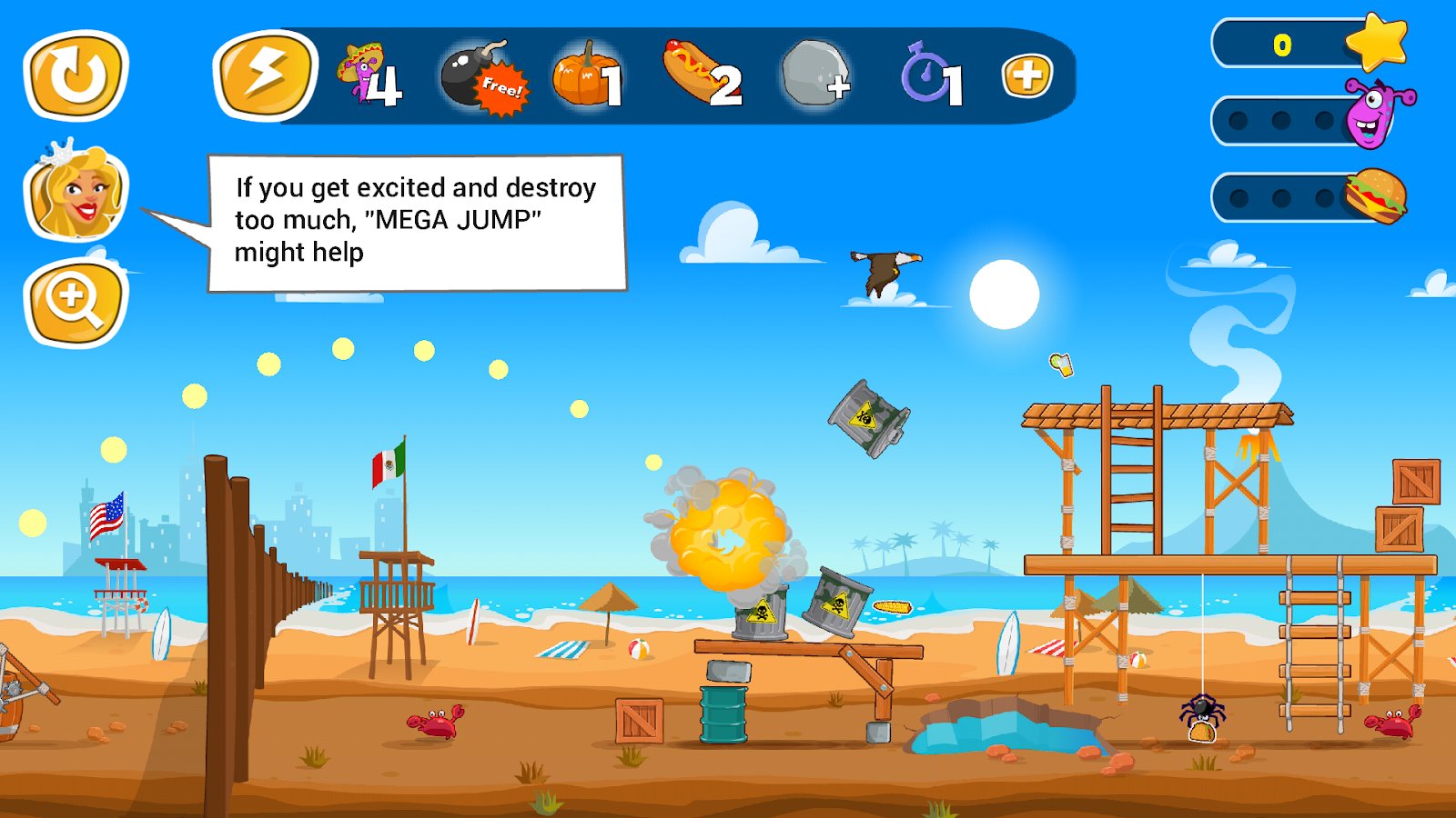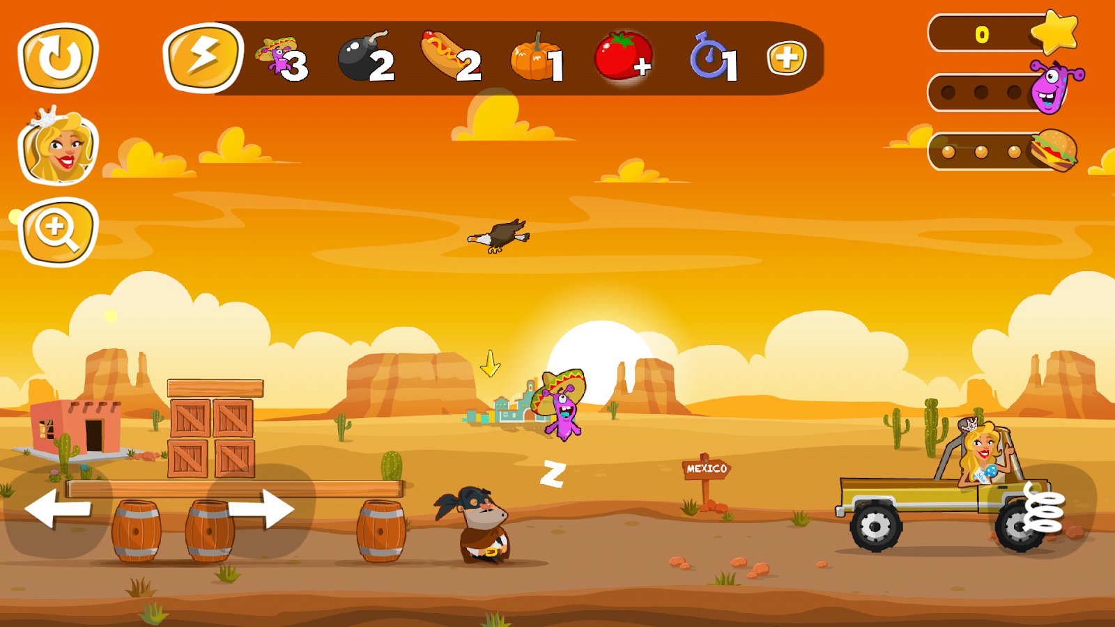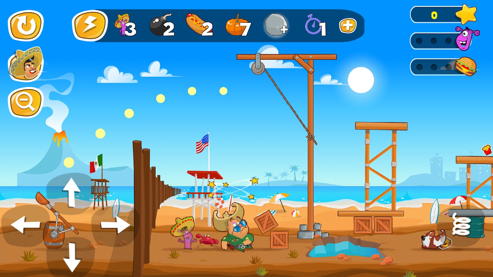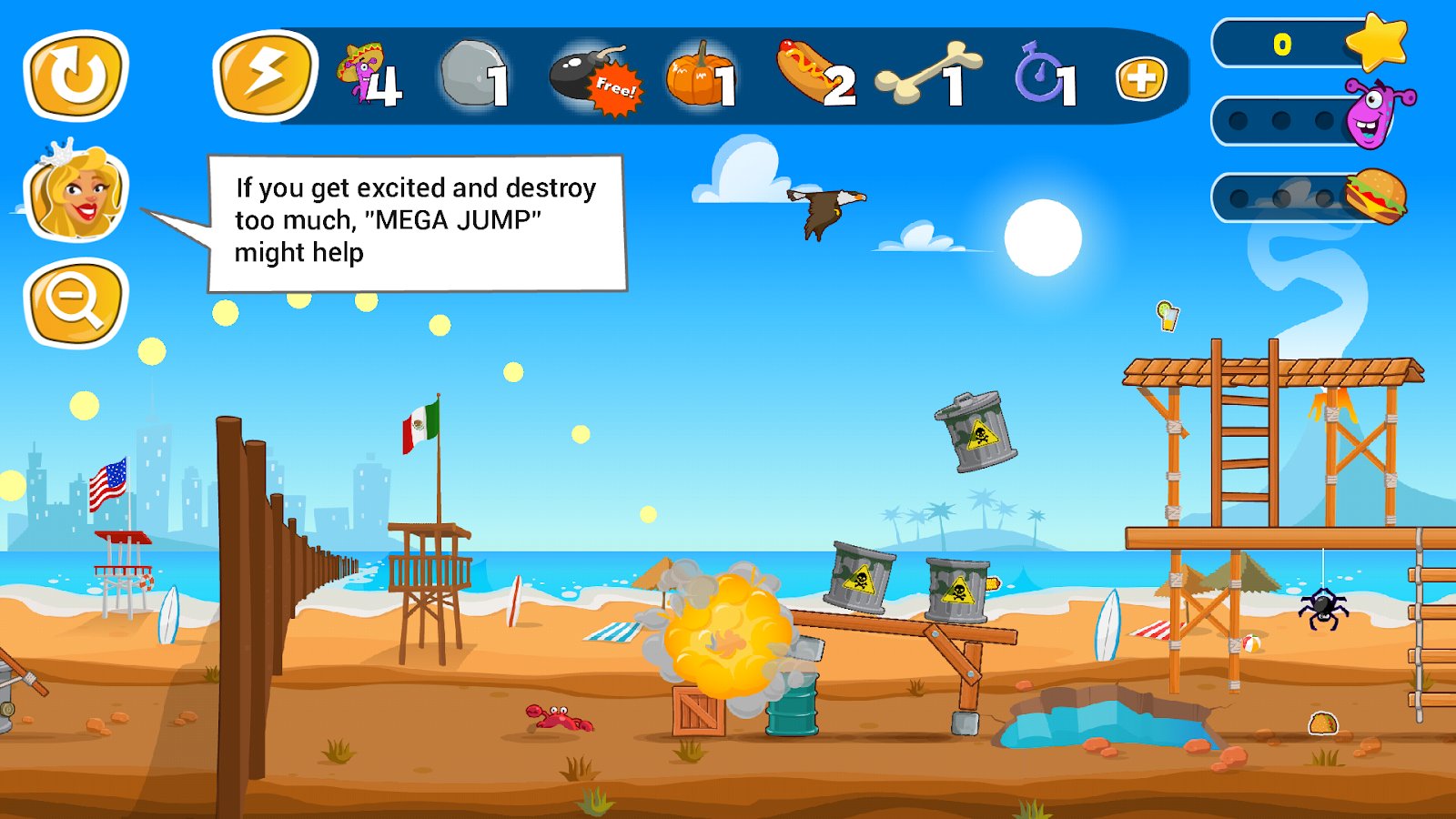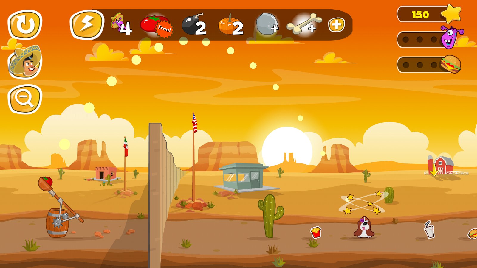 Jump the Wall - Mexico || USA – help the brave alien and help him to collect all delicious food. Our hero travels across the vast galaxy in search of food and fly to the Ground, our hero went on a journey by foot as his flying saucer crashed. Jump from a catapult over the high wall separating Mexico and the United States and gather all the delicious food on the other side. Navigate through a beautiful and picturesque locations and bypass the guards and dangerous animals. Use bombs and other items to clear the way for the hero.