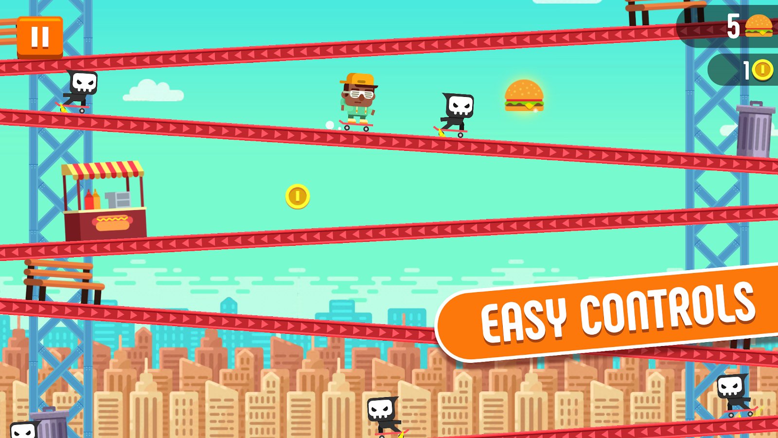 Tap Skaters - Downhill Skateboard Racing - horizontal classic arcade style from the famous Studio developer Digital Melody. In this game you are controlling the character on a skateboard try to go through the convoluted route consisting of platforms, while avoiding obstacles and collecting prizes, and catch robbers. Of course you will have the choice of different characters and their customization.