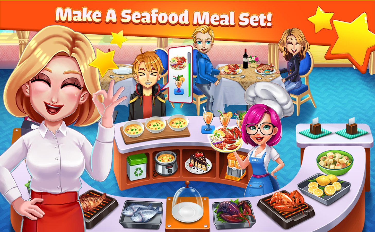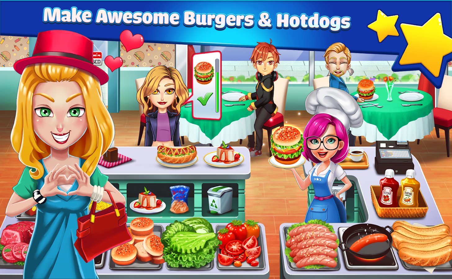 Cooking Idol - Chef A Restaurant Cooking Game – a game on Android where you will play the role of chef. Become a brilliant chef and cook a variety of dishes for hungry customers in your fast food restaurant. Take orders and cook delicious and fast food such as cheeseburgers, hot dogs, fried potatoes, chips, cupcakes and other tasty treats. Do everything as quickly as possible and don t force your visitors to wait long for their orders. Get tips and expand and improve your restaurant.