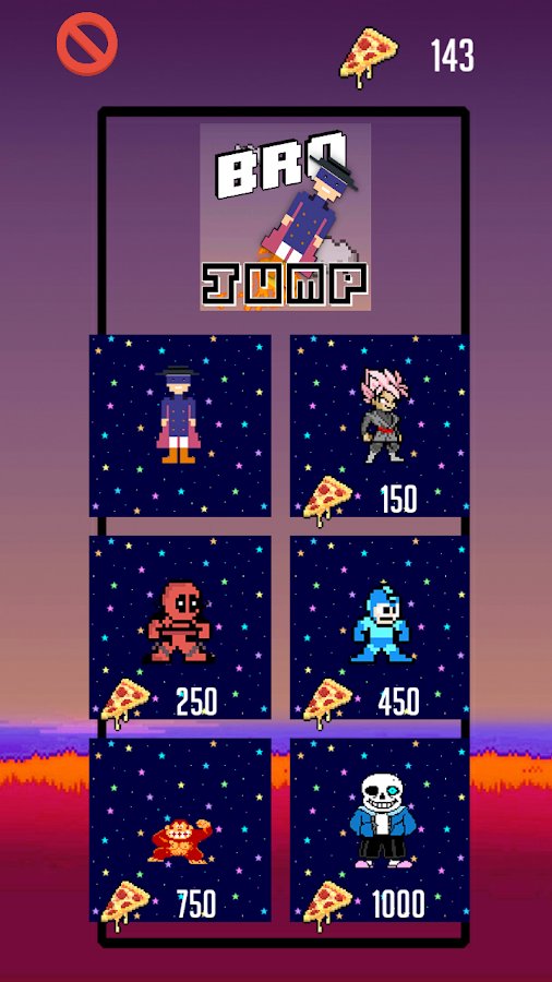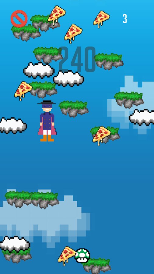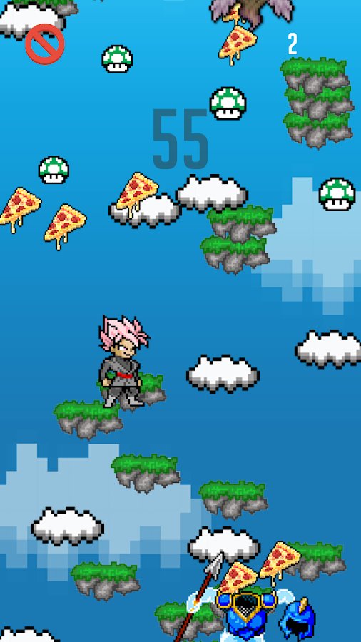 BroJump – entertaining arcade game for Android where you control a hero who rises above all. This game is made in 8-bit style and will delight players with its pixel graphics. Run forwards and jump along the platforms while collecting as many points. Collect pieces of pizza and avoid the numerous enemies. Control your character by tilting your phone and guide him in the right direction.