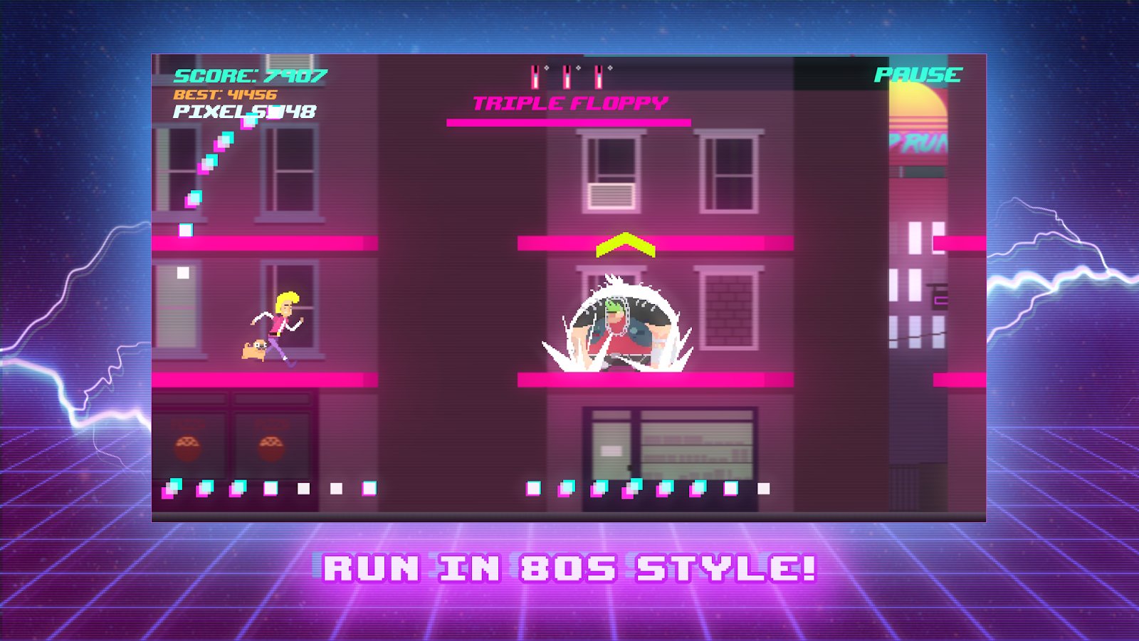 Top Run: Retro Pixel Adventure is a horizontal adventure game with elements of platformer the creators drew inspiration from popular designs of the 80-ies and 90-ies, both in the gaming industry and among the cartoons. So, the main character was a boy named nick who got superpowers and his faithful friend the dog, nicknamed the Ball and now you together with this couple to save his friends and restore order on the streets.