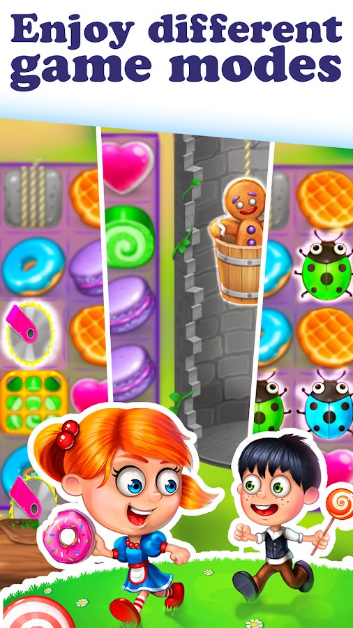 Gingy Story: match 3 – a game genre of three in a row on Android where you will put the rows of candy, donuts and other sweets. In the game you will help Lisa and her gingerbread friend to find Tommy and defeat the evil witch. Match three or more objects and pass the complex test of the game. Use various bonuses and power-UPS as fast as you can go through the levels. Create as long rows of sweets and do combo attacks. Fight powerful bosses and defeat dangerous enemies.