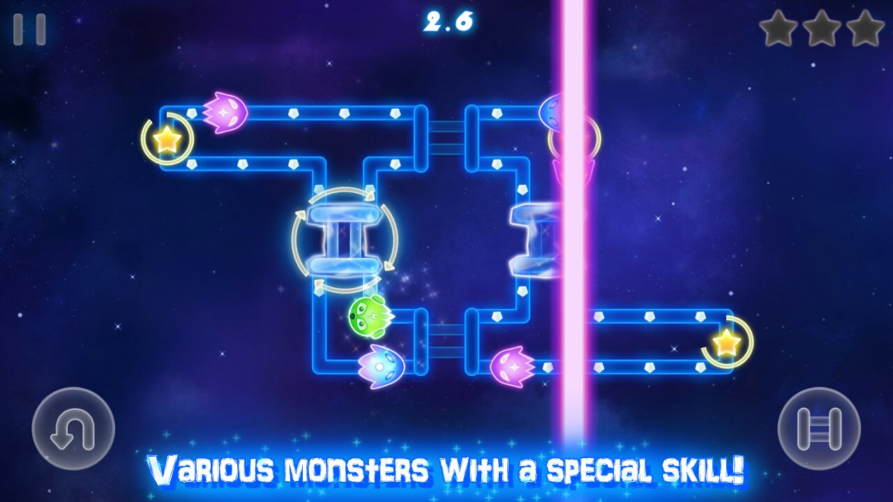 Glow Monsters - Maze survival - a rather unusual game in the style of maze in which your task is controlling the movements of the various monsters to eat all the elements in the corridors of the maze, it is worth considering what each monster is unique, and they move independently. The control occurs by means of changing the direction of various components of the labyrinth, thus directing the characters in the right corridor. The stylish neon graphics and fun soundtrack that complements the gameplay.