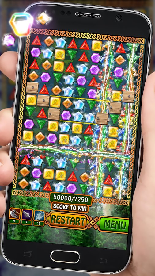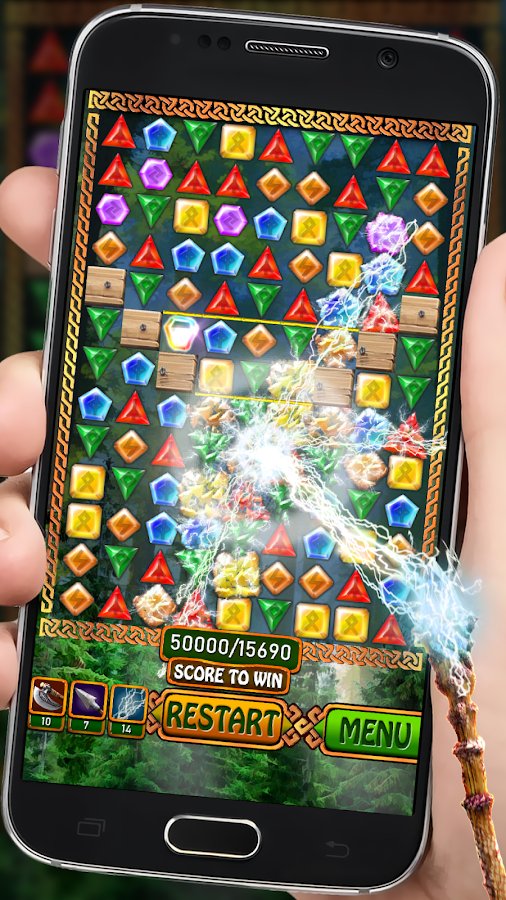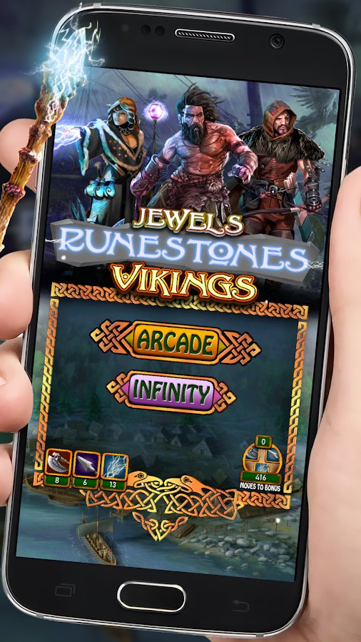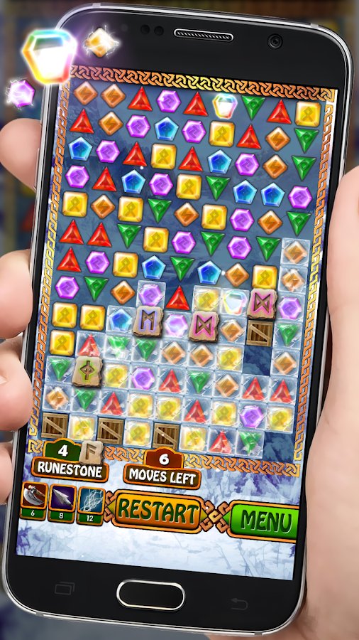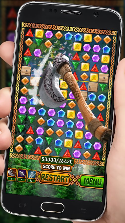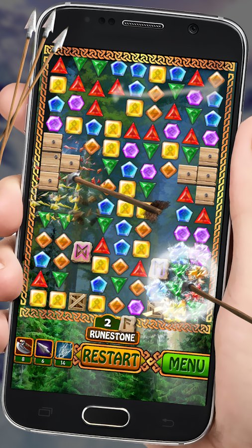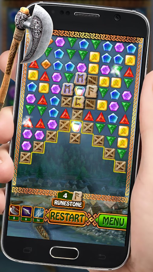 Jewels - Viking Runestones – a fascinating game of the genre three in a row on Android where you will form rows of colorful crystals. In this game you will go on a fascinating journey through the lands of the Vikings, and together they will solve numerous puzzles. Match three or more crystals and start a chain reaction of explosions. Make good combinations and use a bow, axe or magic in difficult situations. Discover new levels that will delight you with interesting tasks. Game players will appreciate the colorful graphics, stunning effects and enchanting bonuses.