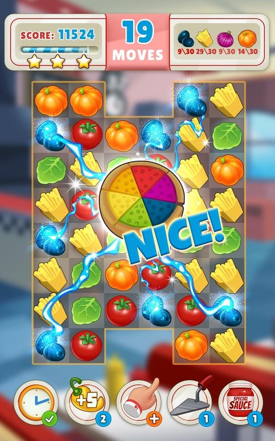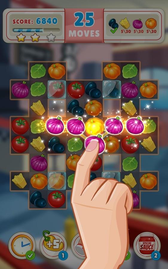 Kitchen Frenzy Match 3 Game – match fruits and vegetables in the kitchen and go through the exciting levels of this game. Sort between the various objects and dive into the world of cooking in this game for Android. Match three or more objects and have a chain reaction of explosions. Use various bonuses and power-UPS and beat levels faster. Set your record in this game and try to complete levels in the minimum number of moves. Ahead of you are tasty bonuses and easy, and intuitive.