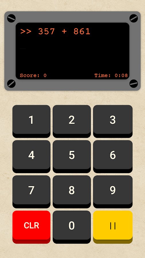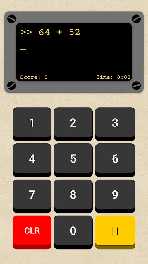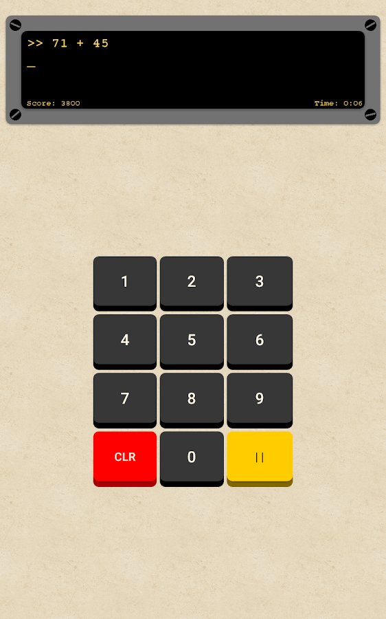 Calc in the mind - a Math game, quiz – old school puzzle game for Android where you will solve mathematical tasks. In this game you have to rely on their ability to count and perform various actions on subtraction, division and multiplication. Play this exciting game and play through all five levels of difficulty while solving the five types of tasks. Solve a variety of tasks and climb higher in the leaderboard and achievements. Compete with your friends for the best scores and enjoy the game.