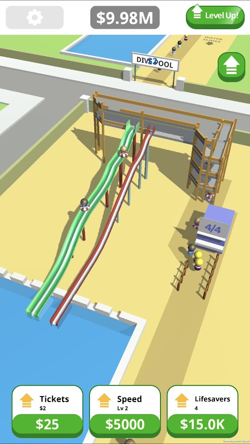 Idle Tap Splash Park is a fun clicker on Android, where you will create your own water Park. In this game your main task will be to create the most popular water Park in the world and invite as many visitors as possible. Touch the screen of your phone or tablet as often as possible and watch the flow of people who want to get into the highest and most extreme roller coaster in the world. Invest the profit wisely to create unique slides. Do your best to keep your Park ranked first in the world in popularity.