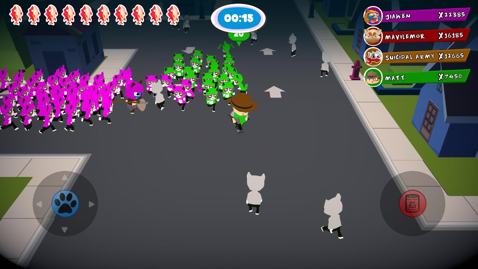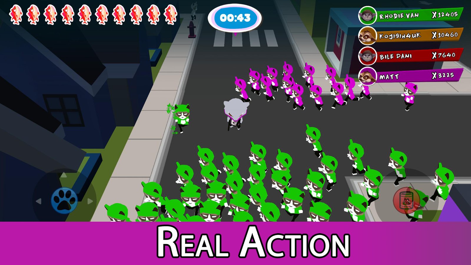 Crowd Cat Battle Royal online battle on Android where your task will be to gather a big crowd of cats. In this game your hero will travel the streets of the city and on the way to collect cats. Defeat your enemies using various weapons and steal from them cats. Wins the player who remains single and who will have the biggest crowd of cats. Challenge players from all over the world and participate in online matches with real people. Pick for your character a unique look and discover your style of play. Buy and collect skins and climb as high as possible in the leaderboards and achievements.