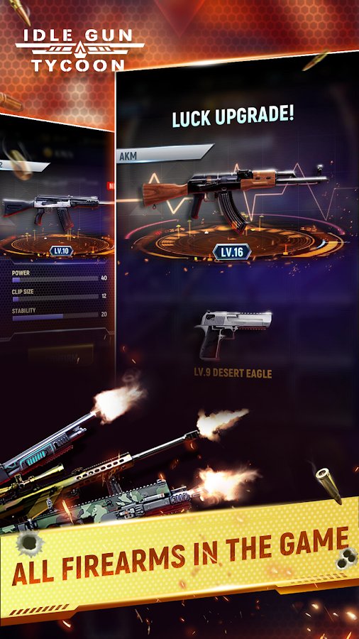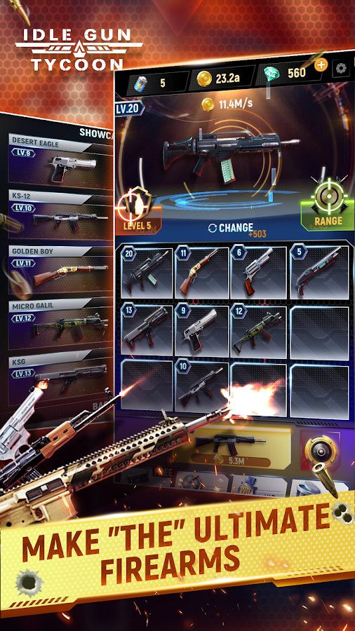 Idle Gun Tycoon - clicker on Android, which creates a fully interactive real world experience. In the game there are more than 50 types of firearms. Combine the same weapons to get a new higher level. Invest your money wisely, to improve your gold income to become richer and buy more powerful weapons. All you have to do is aim and shoot, hitting the target.