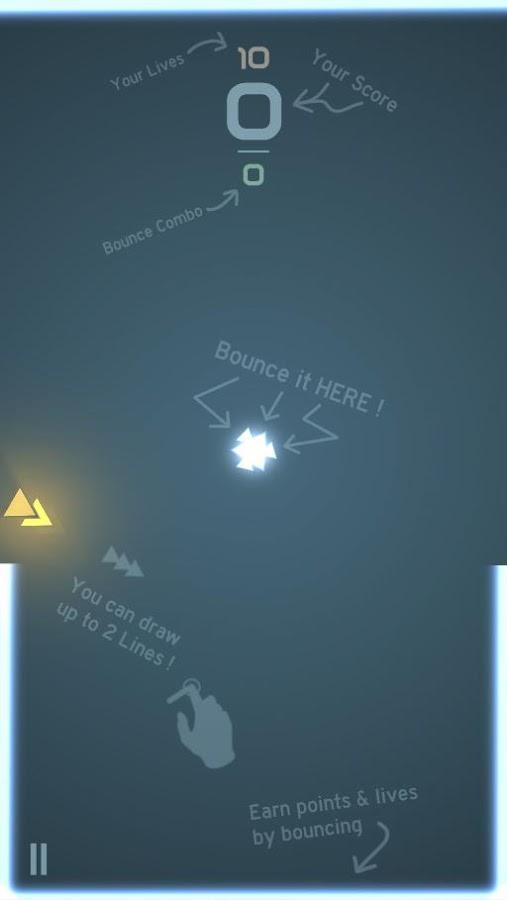 Glowry Bounce - a simple game for relax mind and body. You have a limited number of lives, and the opportunity only twice to draw two lines at the same level. These lines will serve as a wall for your ball. The ball is activated when you draw your first line, the task is simple, just kick the ball into the goal in the center of your screen and go to the next level. If you are not one line, draw a second, but in any case do not let him slip away beyond the framework, otherwise you will lose one life. Show what you can do and achieve the best results without losing all the lives!