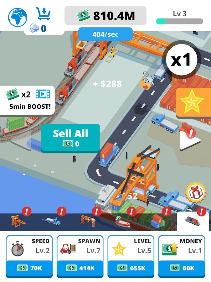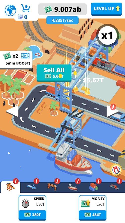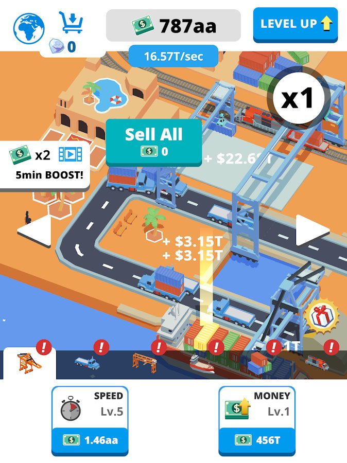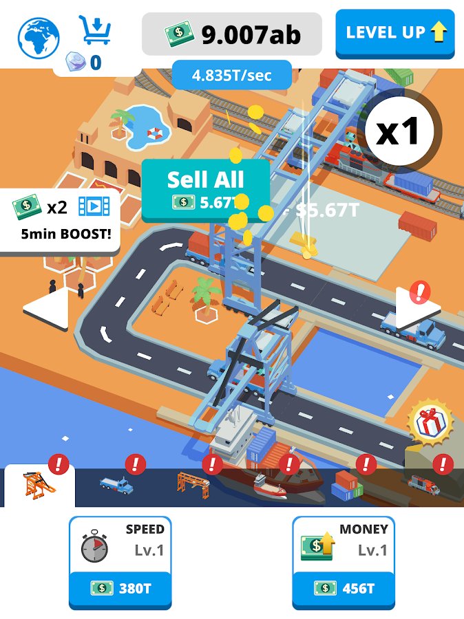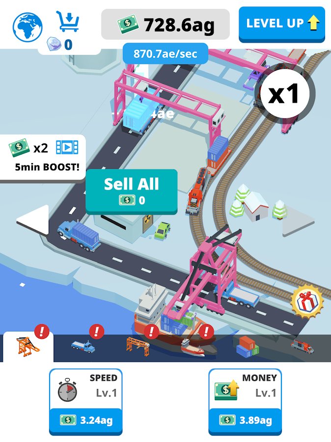 Idle Port Tycoon - in this likere you will have to build the ports, but also responsible for the future of the world. On the Ground are going to attack the alien creatures and completely destroy it, go to the past together with his team to build a reliable protection. Task quite not simple, but you do not need much effort, just build and earn money, develop your Empire by building more ports, don t forget to build defenses along the ports and then you just get to save the world. Just click on the screen to build ports, press to add the containers, load them, send the goods to pass new levels and defeat the aliens!