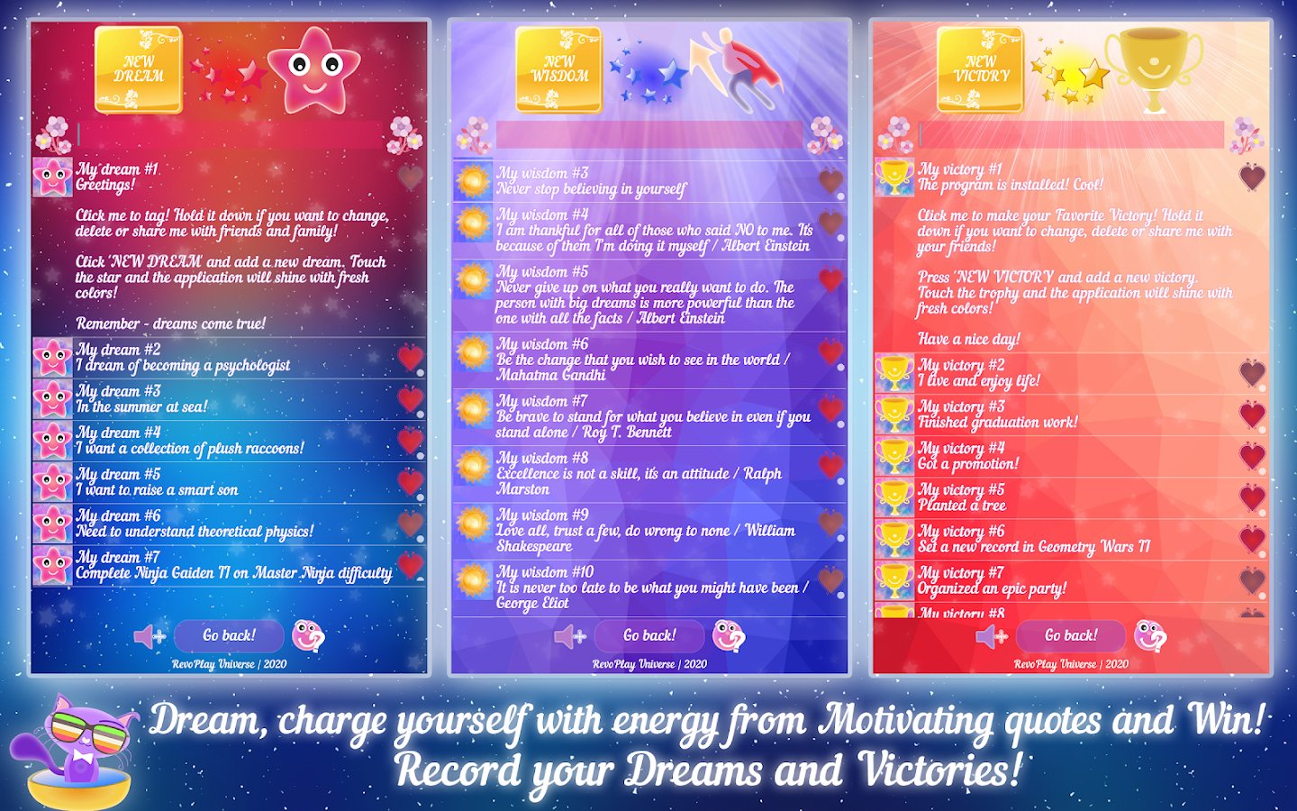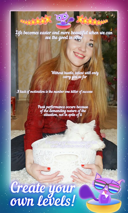Happy Style - Play, Relax, Dream, Live! is something new in the genre of Werewolf or Shifter . This app for Android for each day, which will be able to relax, cheer up and give a good mood. This game is very diverse. First, this app is for morale, which will sustain you warm word or inspire you to new achievements and feats. When you are broken or do not want to do anything, just run Happy Style. Just remember all the reasons to be proud, as well as dreams and desires! Secondly, it is a standard arcade game with dynamic gameplay that uses all the good words that you once said. The game was created with a single purpose – to calm the irritable and nervous people to save their nerves. Along the way, there is also a story company, where you will learn a completely foreign, but at the same time its history.