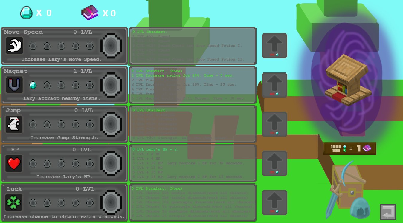MainCroft Run! – a runner with all sorts of quests and adventures. In this game you will assume the role of a brave knight named Larry. This is no ordinary knight, is heir to vast treasures that are protected by a powerful skeletal archers.To find and win these chests of jewels you need to pass level after level, gaining experience. The experience you will be able to invest in upgrading your hero, namely in his skills such as movement speed, magnetism, jumping ability, a number of health and simple luck, which will be helpful for all.