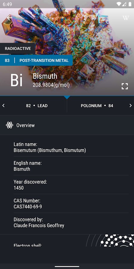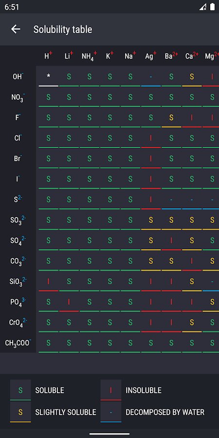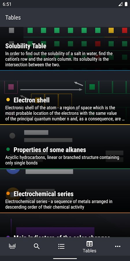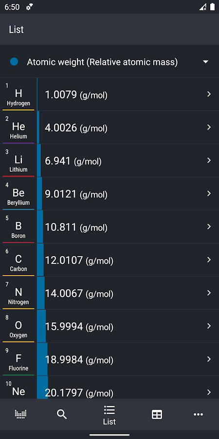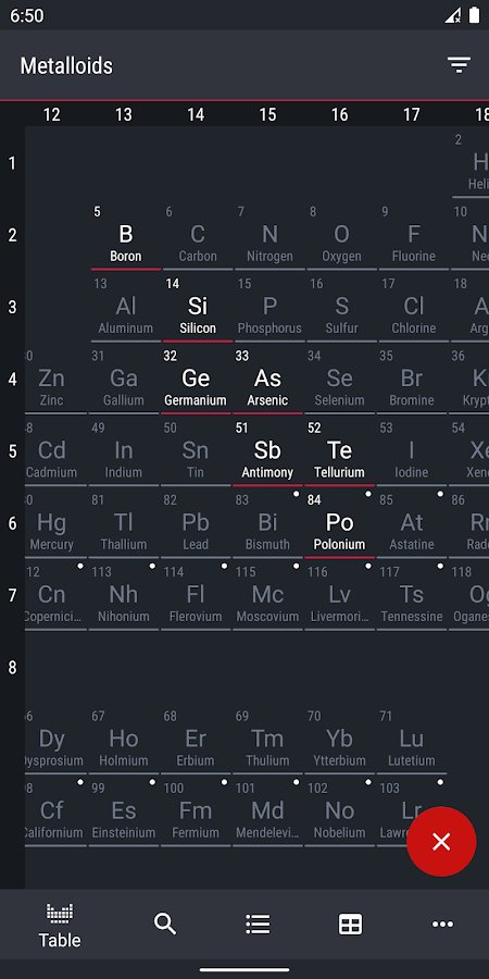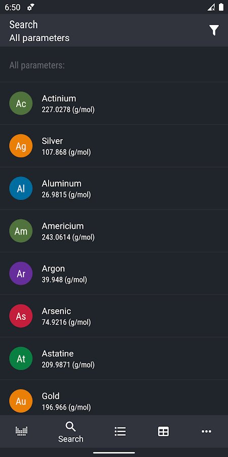 application periodic table 2020 - Chemistry , you will plunge into the wonderful world of chemical elements and learn a lot about their unique properties and the entry into a chemical reaction. The program is suitable for both professional chemists and beginners. Your attention is presented a table consisting of 8 different groups. Learn the properties of metals (refractoriness, melting point, density etc.).You will be able to quickly find the desired item, show its symbol and name in the periodic table, to know the level of solubility and other properties.
