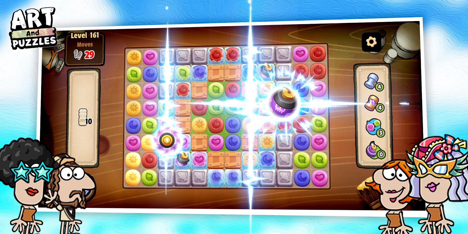 Art & Puzzles – welcome to the world of luxury and wealth! Go through the levels, match the right combination of gems and get rewards. Find friends, unite in clans and have fun together. Awaits the endless sea of bonuses and prizes, unlock all available locations and explosive combinations to destroy as many rows at a time. Collect trophies, carry out little tasks, participate in competitions and win. Think over your tactics and successfully apply it, grow up and move on.