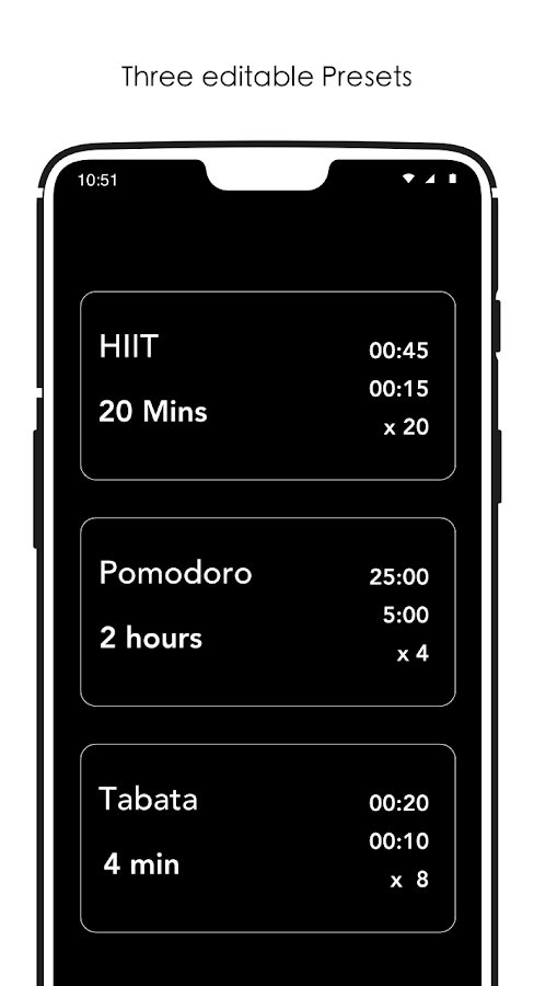 Set intervals of different durations by using a simple timer for Android Strive Intervals. It is convenient to use for sports and trainings of different directions . Three built-in presets easy to customize to fit your needs and handling. The program has 2 modes short and long session, consisting of thirty cycles. You can at any time to put a pause during the performance and to take time to relax, and to select specific periods of activity (minimum increment is 5 seconds to 1 hour).