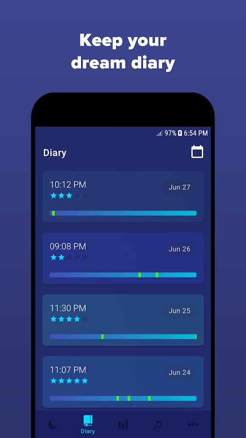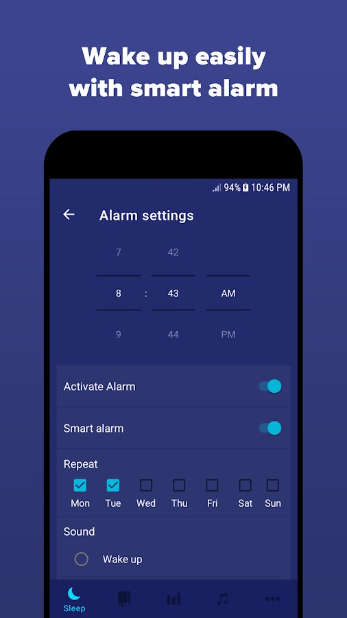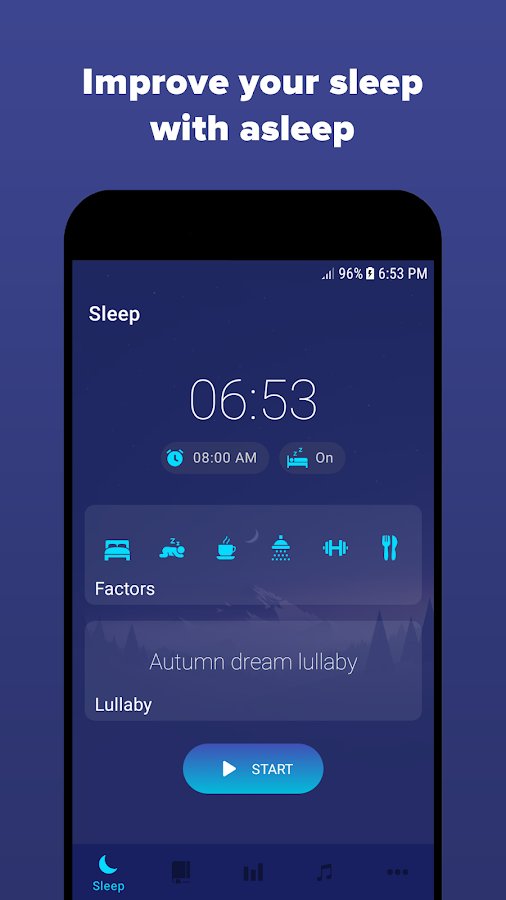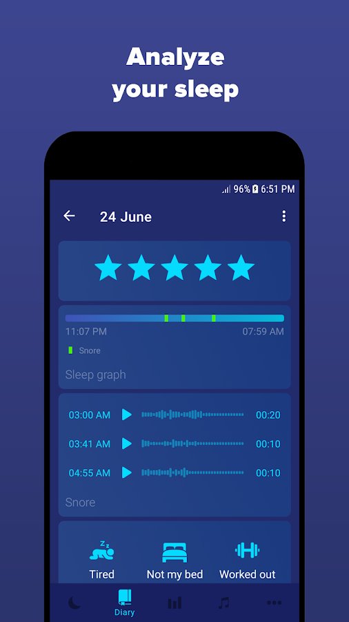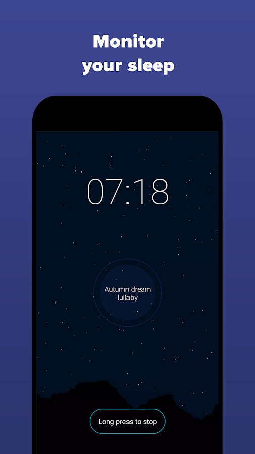 If you can not sleep after a hard and busy day, the application will asleep help you in this. Relax under the pleasant sounds for sleep or meditation, set the function to anti-snore and you can t stop quickly calm down and sleep. Install Smart alarm , put night sounds recording, to help monitor your sleep and sleep intervals, choose the right phase of sleep, keep the important data of this monitoring. So you ll be able to check the factors that affect the quality of relaxation and sleep, and choose the best relaxing sounds of different genres.