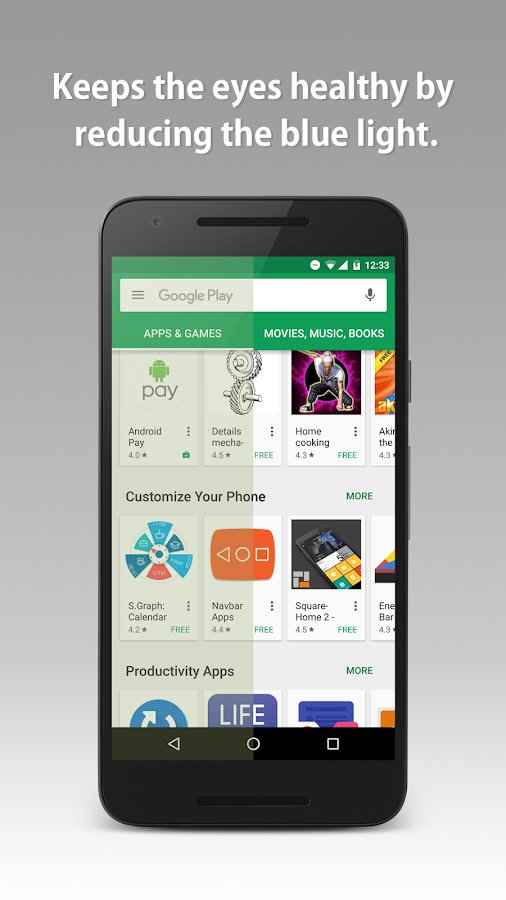 Your eyes get tired from the annoying blue light? Blue Light Filter Pro will help you to get rid of him, keeping eye health. Intuitive interface and simple control functions allow you to control the filter settings for individual apps device,change them using the status bar. Edit the hues and saturation of colors, adjust the intervals of the enable and disable functions, use the widget on the screen for quick access.