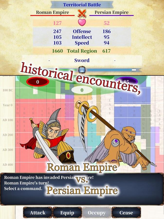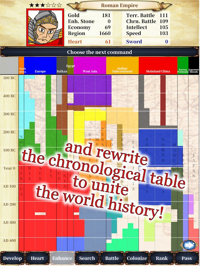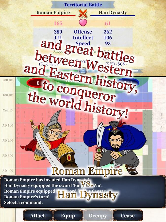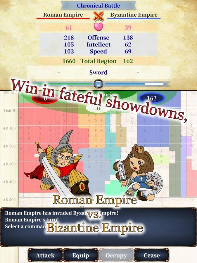 Conqueror History – step back in time and move on to the chronology of world conquest. Participate in the strategy and fight even before our era, follow the epic battle and the colourful plot and colorful graphics. Train your skills and upgrade skills, collect trophies from each piece time and conquer different tribes and peoples. Consider your strategy and tactics, use the available weapons and cunning maneuvers, explore the site and collect the necessary resources for survival.