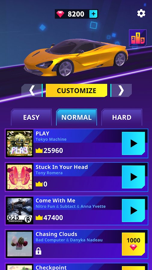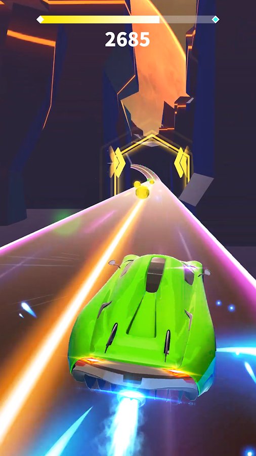 the theme of the game is simple and fun: overcoming obstacles and collecting bonuses in different categories on a cool car under the energetic music. The card includes a change to more mellow tunes. Collected bonuses can be spent on the skin of the car or different types of amplifiers and bonuses. Neon and luminous colors on a black background bring the visual comfort in the passing game, and classic will not bring inconvenience during the game.
