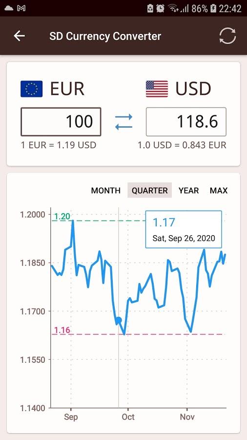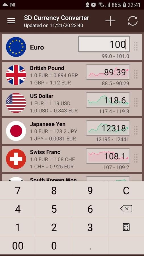 SD App currency Converter will allow you not only to know current exchange rates, but also to calculate the amount of a fee, translate one currency to another in off-line mode. Collected here are more than 450 types of currency, including cryptocurrencies, metals. Built-in rate graph, several verified sources, add favorites to the main screen, sorted lists, automatic conversion with specifying the price, the selection of the cross-rate, gestures, regular updates and other features will help you convenient, fast and easy to manage accounts and to be aware of new changes in the currency exchange market.