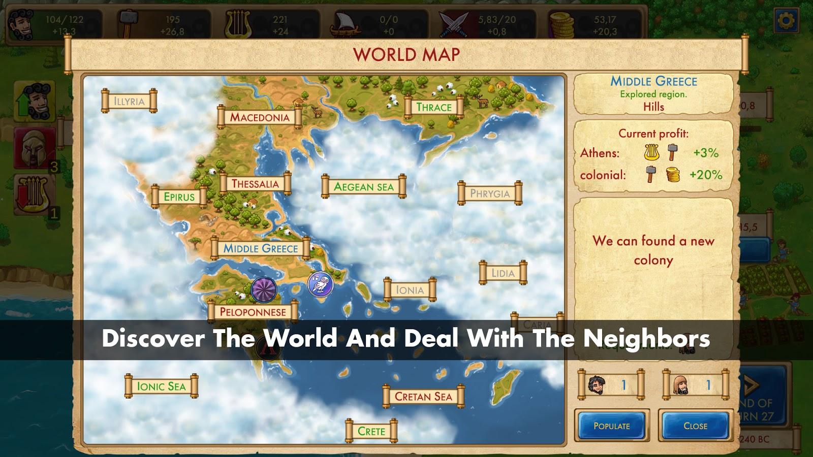 Strategy game where you have to lead a tiny settlement in Ancient Greece and turn it into one of the most powerful poleis - Sparta, Athens or Corinth. Depending on the choice of policy is determined by the strategy game: the war for Sparta shopping for Corinth and diplomatic for Athens. You have to resist the intruders and to survive natural disasters, and to allow internal unrest. Intelligently distributing workers, you will be able to ensure a constant production of resources that will help you develop your settlement.
