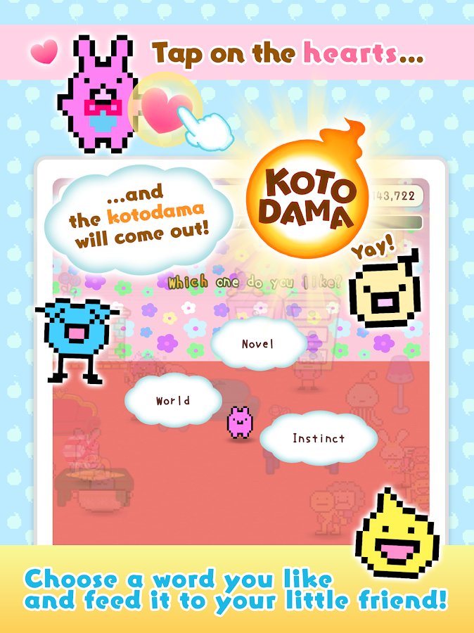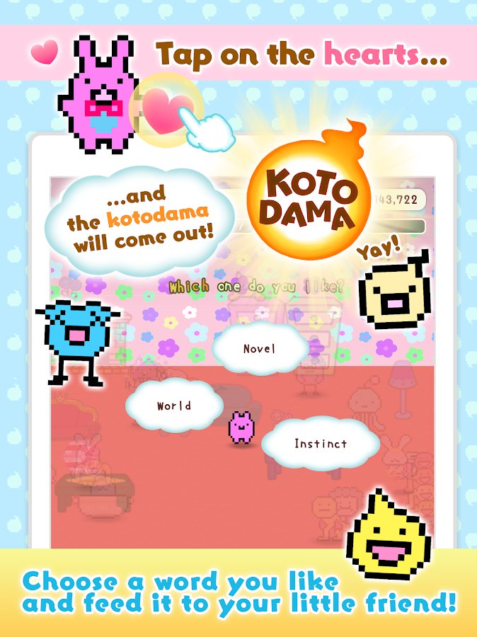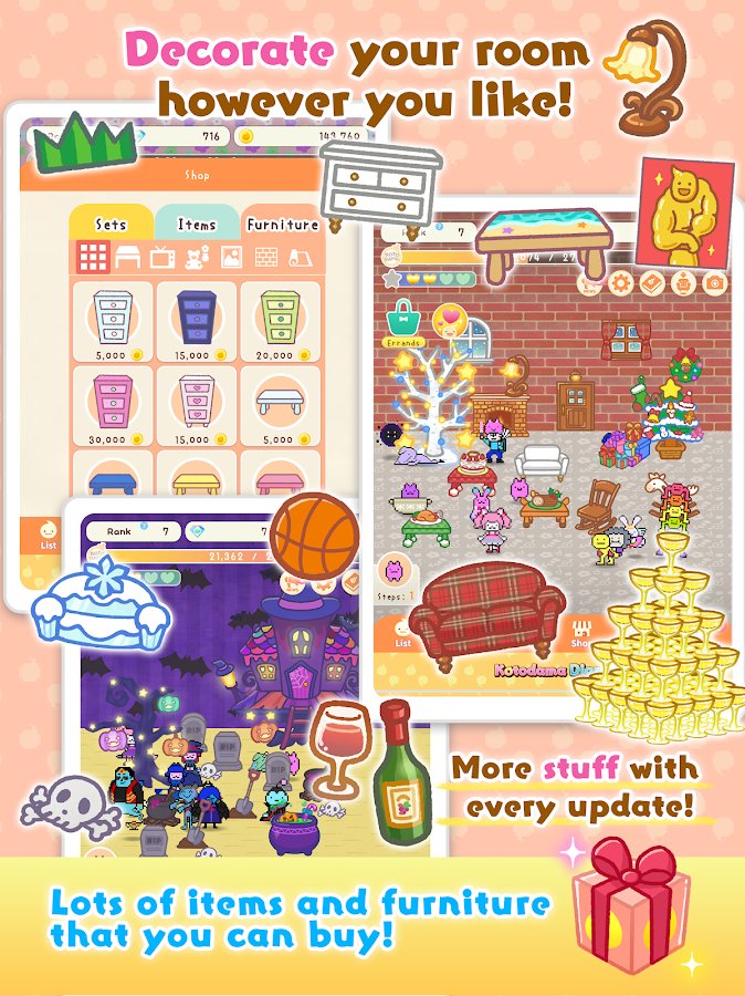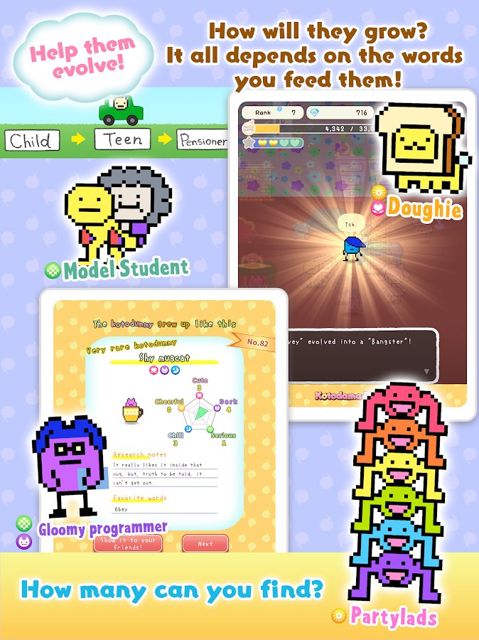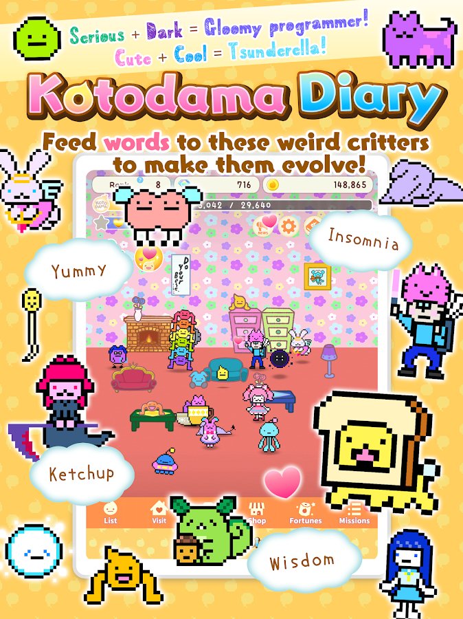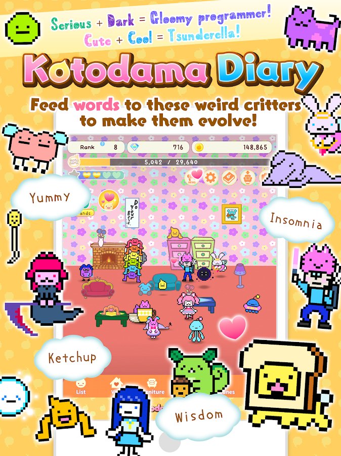 Kotodama Diary - the game is not only for children but also for adults! Grow cute, weird, angry, kind, sad, happy or even rude characters and become part of their tiny lives. Decorate the room with beautiful things, keep a dialogue with their “babies”, talking about how beautiful they are and properly educate, you ll regret it later. Collect heart and sprocket, get experience and coins and create a real family of fantastic and strange Pets of Kotodama. You can also give them accessories that to get something in return.