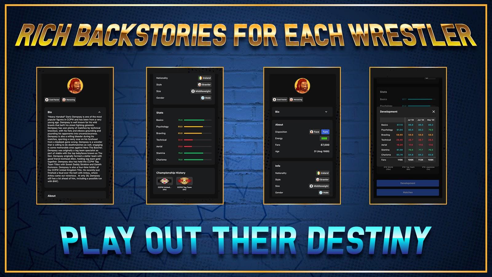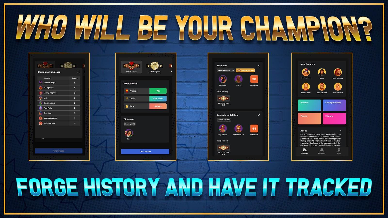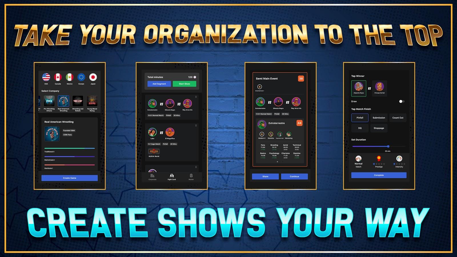 Become CEO of the process for the struggle between the 20 different teams (USA, Canada, Europe, Japan, and Mexico)! Choose where will be fighting who against whom, the number of participants, think how to win more fans, make an entertaining show or a clean fight. Many teams have reached the heights, but there will be new and will challenge them to develop, make popular all over the world. In your hands the career of every company, so think how to use it correctly.