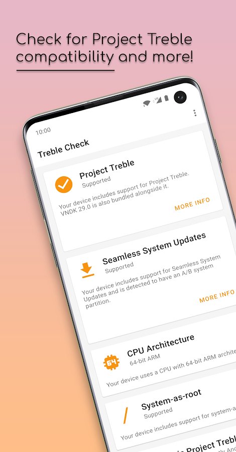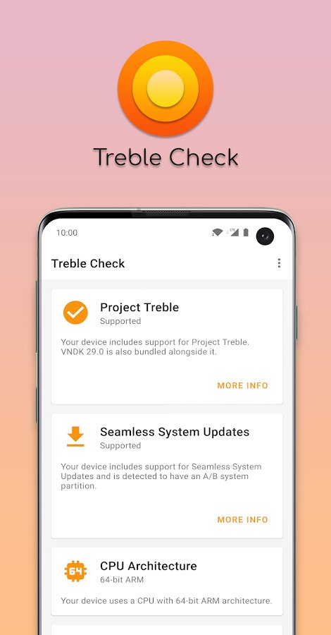 Check Treble - Treble Compatibility Checking App - this app which is to learn, if supported on your device to Project Treble. This information is needed in order to find out the type of firmware of your smartphone with instant result. the process of recognition information is processed in automated mode. The program checks for seamless system updates, architecture and mechanism of binding, the presence of root access works with both dark and light theme. With the help of Project Treble, you can easily update your Android to the latest versions by splitting the hardware code, but without its restructuring.