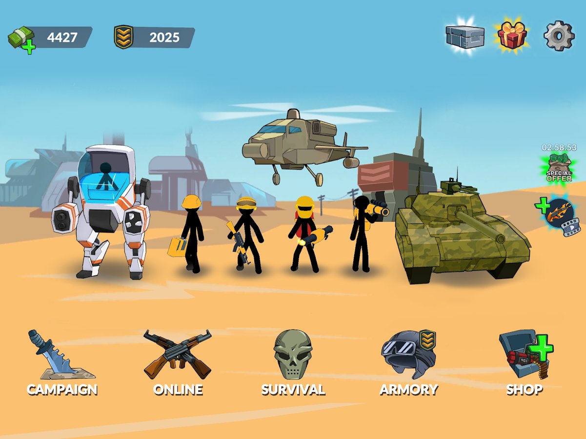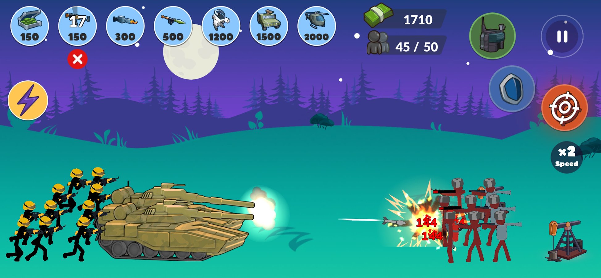 In the exciting game Stickman World Battle, the main character will lead his army and recruit new fighters into it. You will be able to control not only the entire army, but also individual soldiers. Collect weapons and military transport: helicopters, tanks, rockets, upgrade them for full power, train to win in mass battles. You have 3 game modes at your disposal: campaign, online, and survival. Increase your reputation, earn points, gather necessary resources, activate multiplayer mode, and conquer new lands.