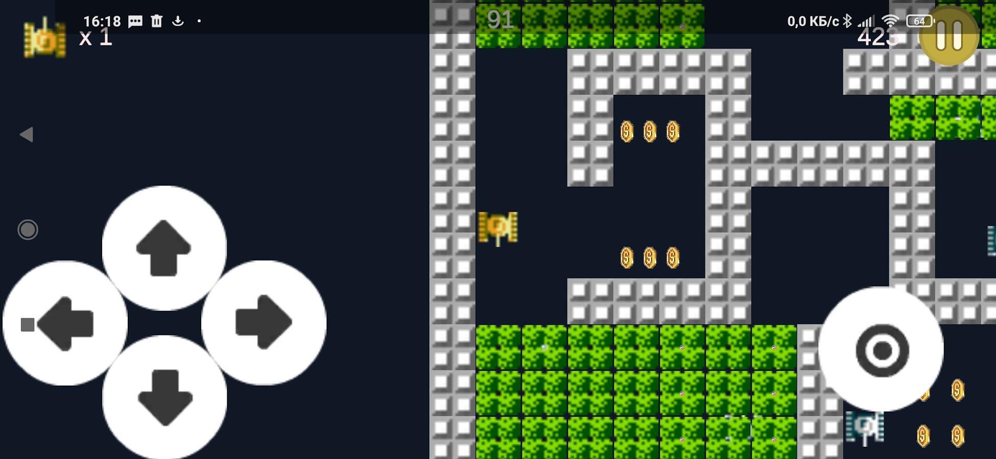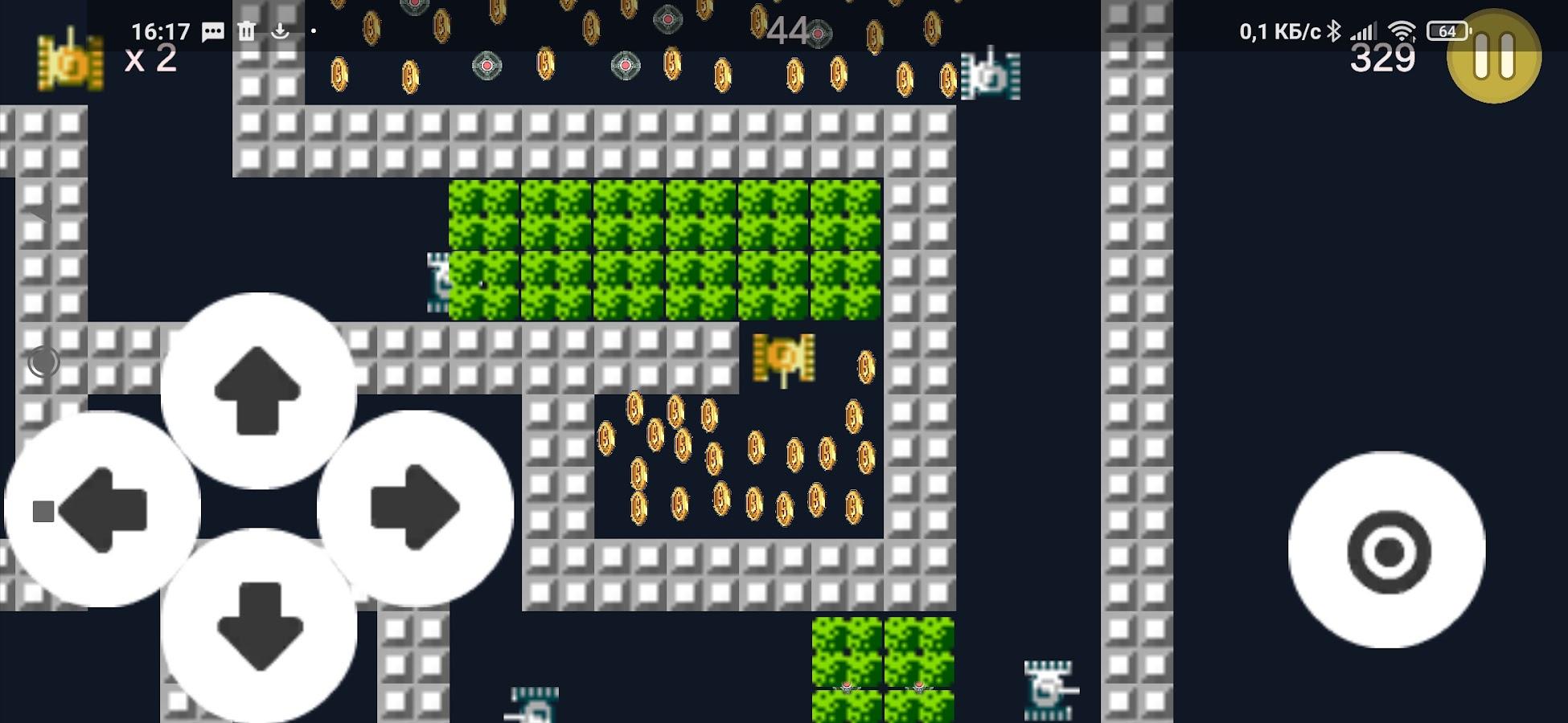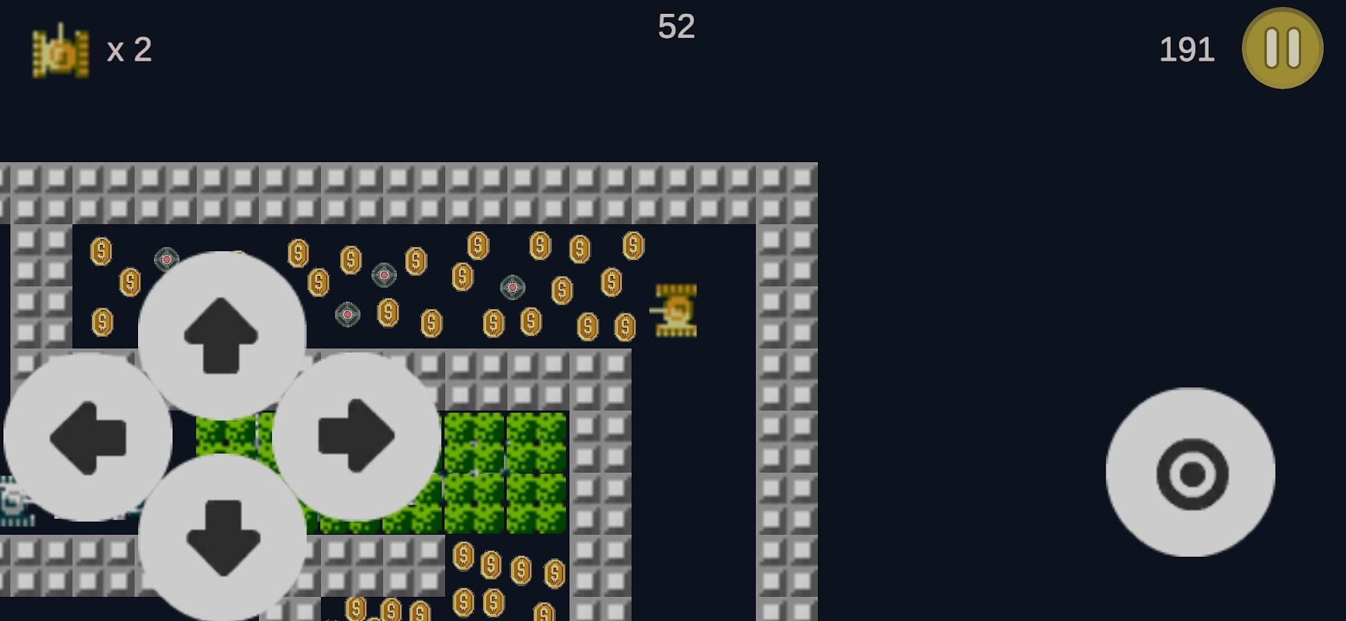 Battle City 3 - Your only task in this game will be to safely navigate your tank out of the maze, avoiding any dangers. Use the 5 standard buttons to move, collect gold coins, and earn experience without wasting your attempts. You will encounter numerous mines and enemy tanks that will try to shoot you down. Find the necessary doors and enter them, but first, collect all available resources.