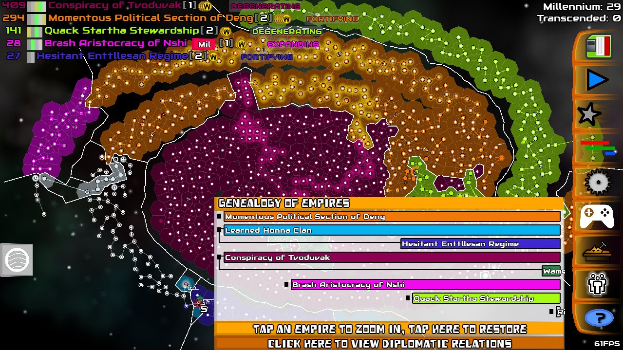 Galimulator – a game for Android where you will discover a world of politics and the endless battles taking place in a huge galaxy. In this game you will control a huge Empire that wants to seize power in the galaxy and subjugate the many space-faring States. Build a huge fleet, and devise evil plans and join alliances with other players to defeat the terrible monsters that had come from other planets. Explore new technologies come exciting quests and unlock new planets. Build new ships and send them into battle with the enemies of the Empire.