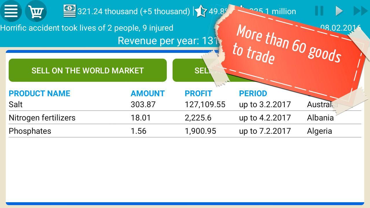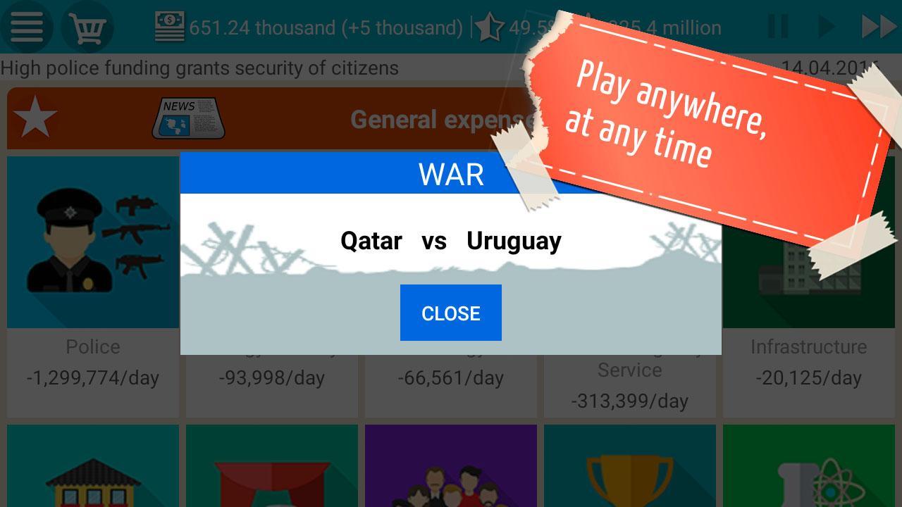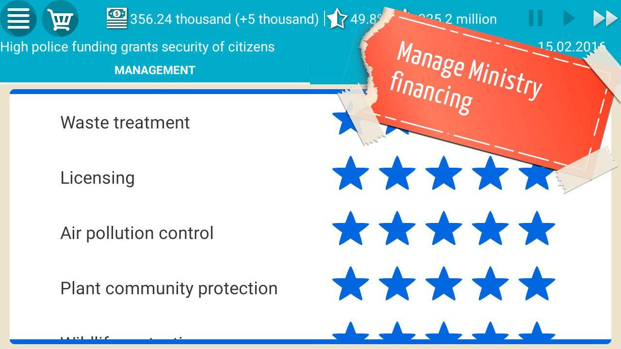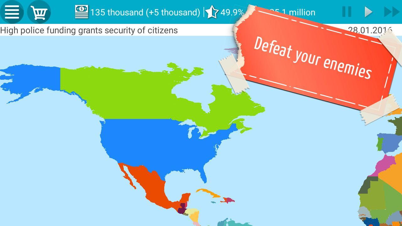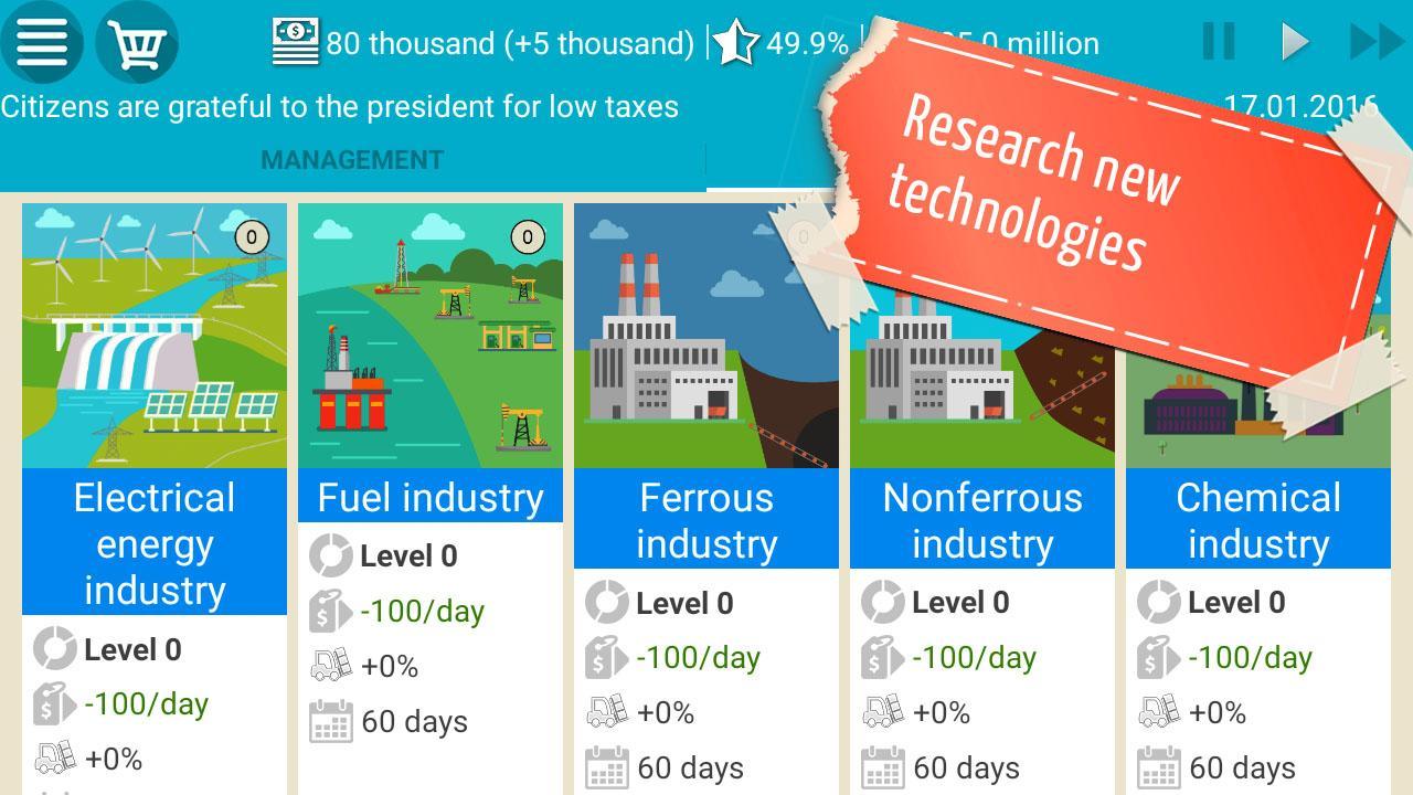 President simulator – simulator for Android, where you can visit in the role of President. If you think that life will be better if you become President then this game is for you, try yourself in this role and rate all the load and responsibility that will fall on your shoulders. President choose what state you will, only in the game represented more than 163 countries. Your task in this game is to raise the economy of his country, to follow the uprisings, to increase military strength, to find the spies and prevent epidemics. Build plants, do trade with other States, take on the work of experienced politicians and diplomats and develop your country. Make their country better and raise your ranking to great heights.