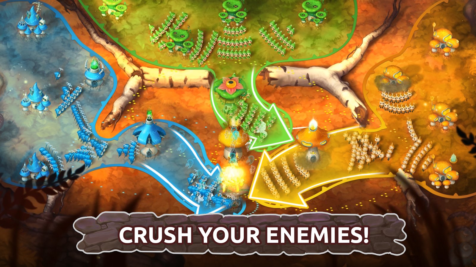 Mushroom Wars 2 – strategy for Android, where you accept your part in the mushroom war. Become a commander and take command over a huge army of mushrooms, fighting against a strong enemy. Choose which of the four tribes, you will fight and perform all missions of the game. Replenish your army with new characters of mushrooms, which due to their unique skills and abilities can turn the tide of battle and help you defeat the enemy. In this game you can also challenge other players from around the world and play in the arena at the same time with 4 players. The game features over 20 episodes in different companies.