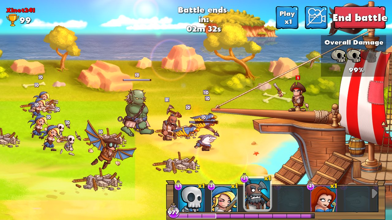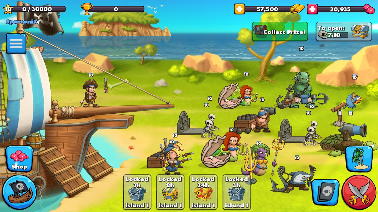 Pirate Brawl: Strategy at Sea – a game on Android where you will operate a brave pirate, who fights with terrible monsters. Your ship is attacked by numerous enemies and your task will be not to let them destroy it. Call for help the many characters who will join your crew and place them in strategic locations. Get ready for an enemy assault and use various weapons and cunning traps to fight the enemies. Search for pirate treasure on a remote island and collect valuable trophies. Become the best pirate in this game and fight with your friends and other players.