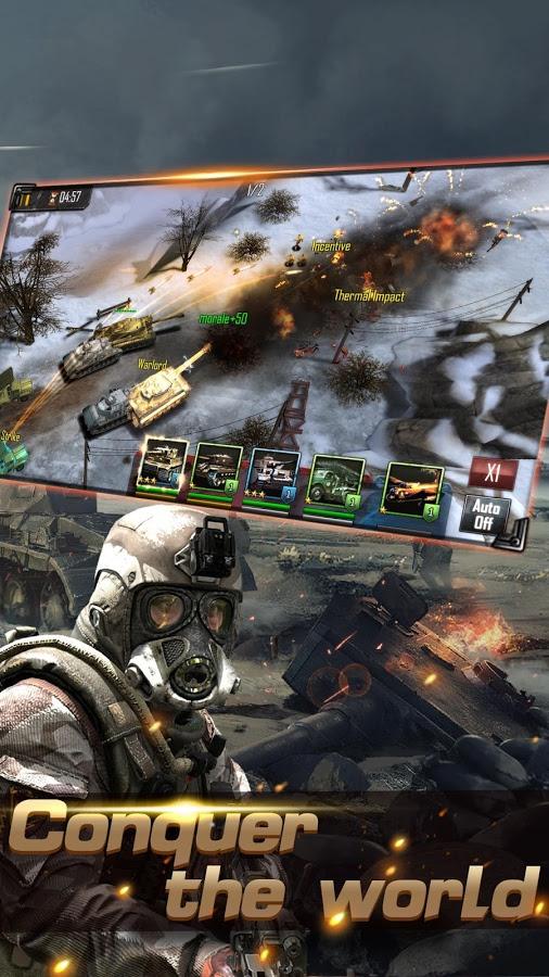 The Great War: Total Conflict – the game on Android, where you accept your part in the world war where you fight for new territory. In this game you will play the role of commander in chief of the huge state and battle enemies for world domination. Build a huge base and defend it from the attacks of enemies. Collect a huge army, command your troops and military equipment and take them to the battlefields. With a single touch of a finger to send troops into battle and defeat your opponents to collect after the battle collect trophies and bonuses. Upgrade your base and Fund new troops of his army. Join alliances and create your own with your friends.
