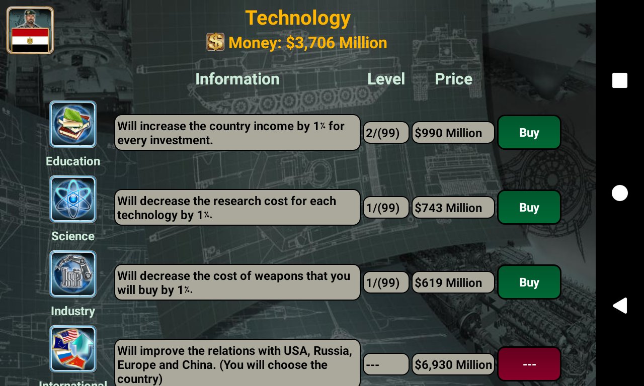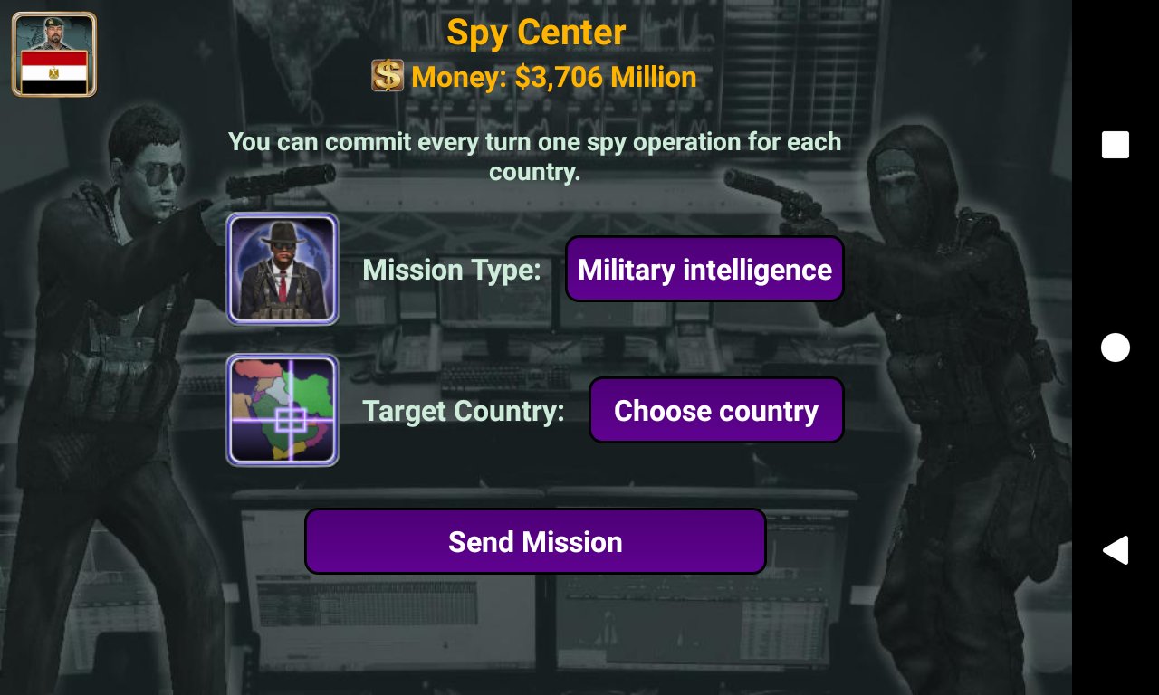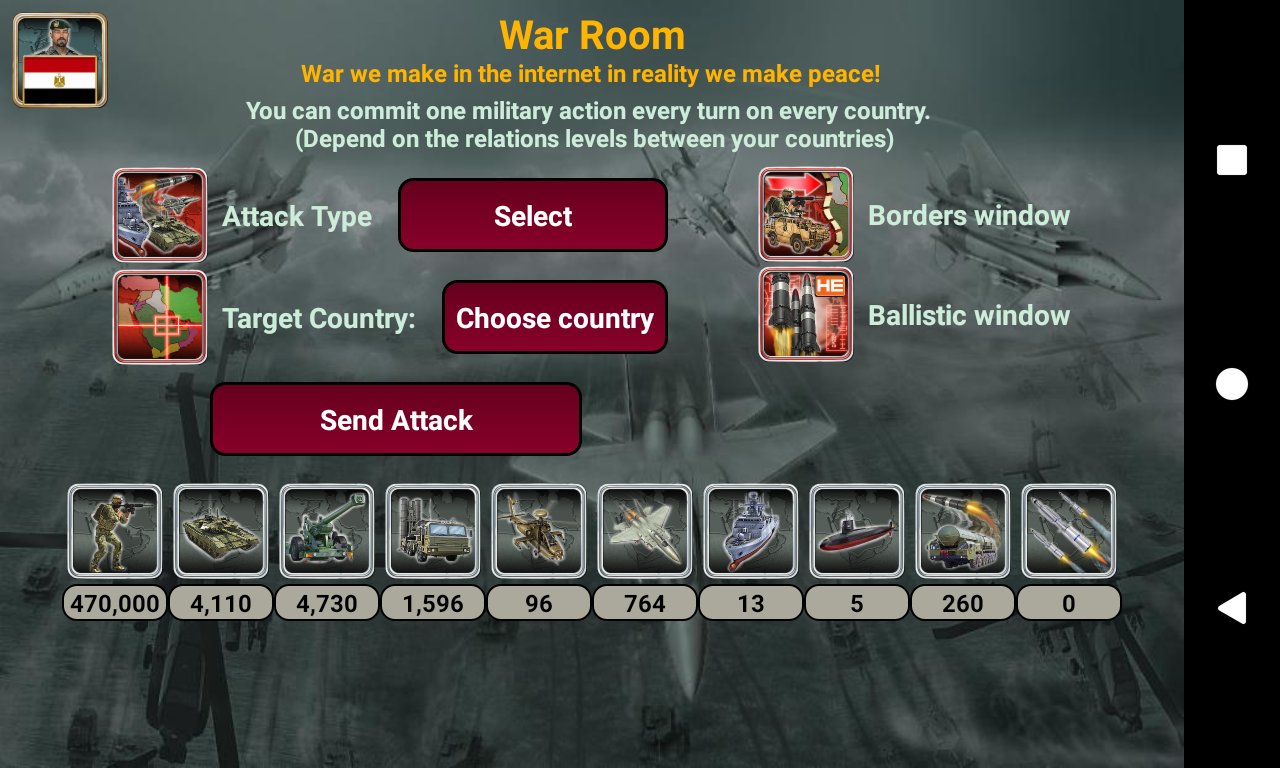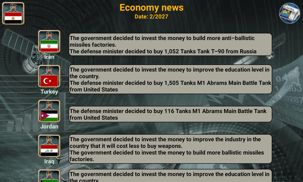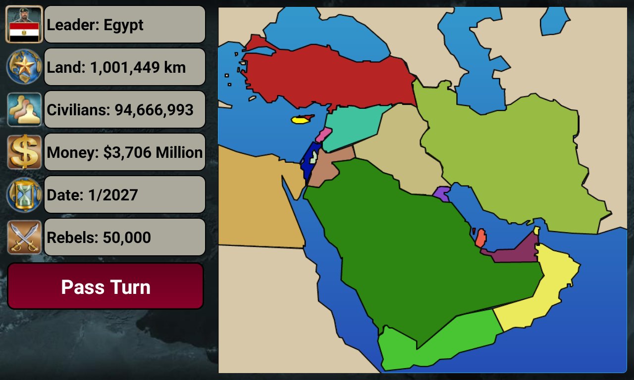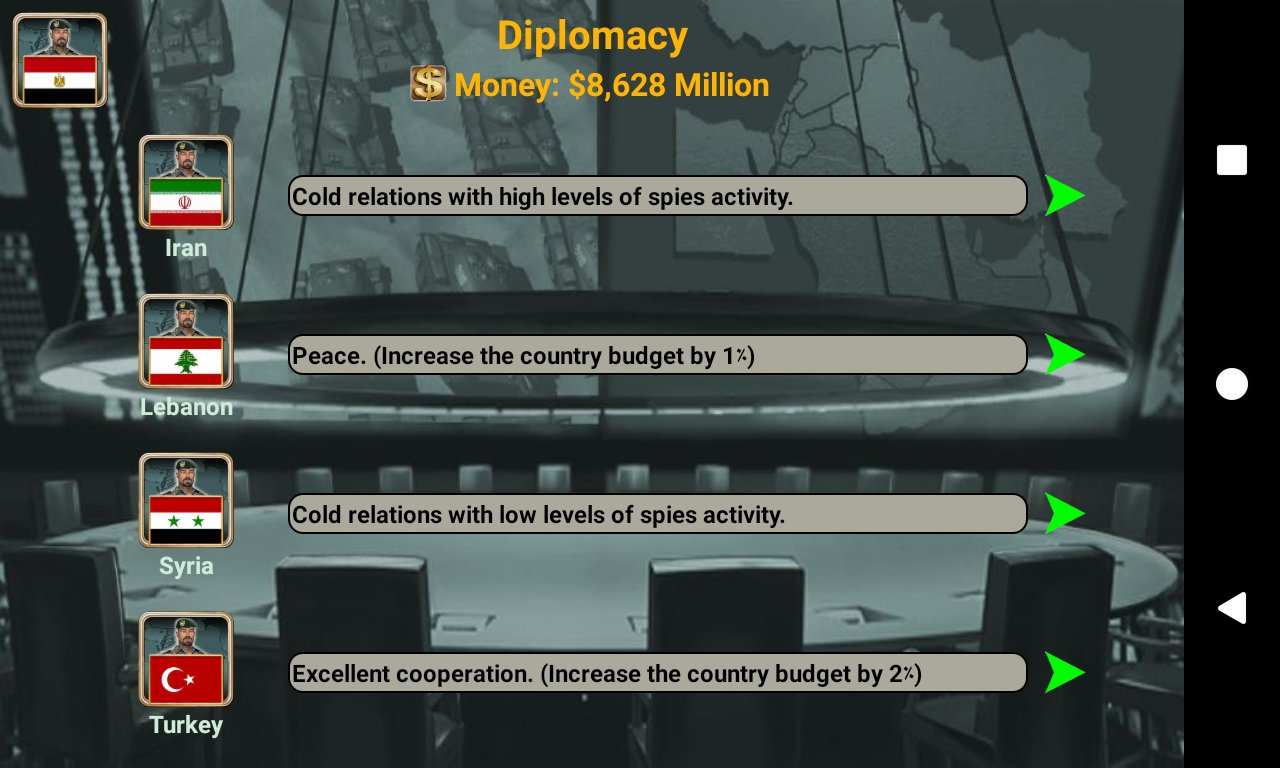 Middle East Empire 2027 – strategy for Android that takes you in the near future in 2027. In this game you will act as the leader of the rebels, who gained power and announced his candidacy in Parliament. Your main goal in this game is to take all the power in the middle East and to create an economically advanced Empire. Develop military relations with other countries, buy weapons and build spy centers, develop technologies and follow world news. Do everything you can to succeed in this game and show your leadership skills.