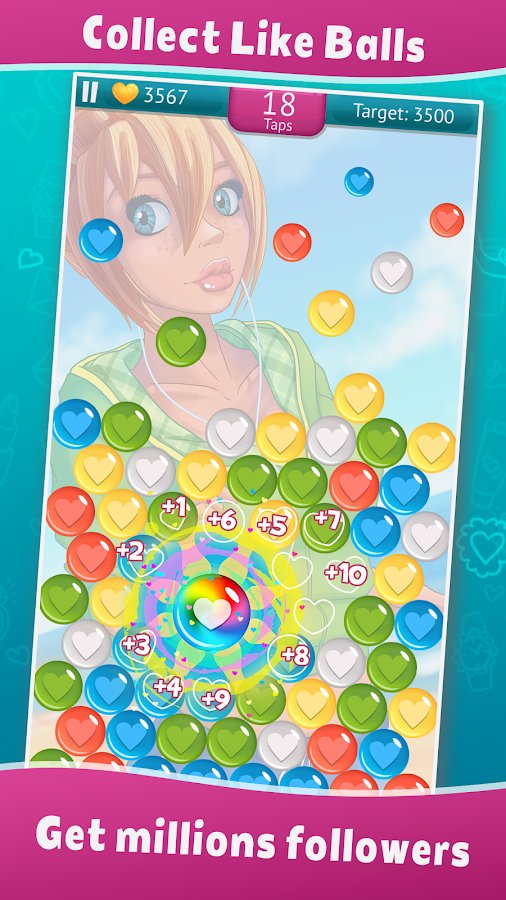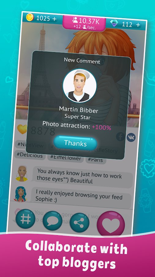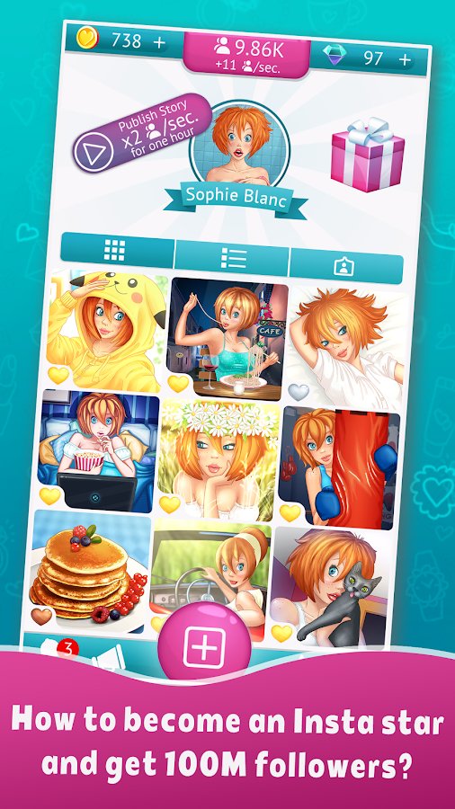 #MySelfieStory: 100M Followers contains at its core a fairly innovative idea, successfully combining the best elements of puzzle games, 3 in a row and clickers. You have to help a cute girl Sophie. She has a dream, a clear majority of modern humans - she wants to become the new star of Instagram. To achieve this, have to go through many exciting trials, including: meetings with popular bloggers, participate in the famous talk show, ordering effective advertising and much more. Share vivid photos with well-chosen hashtags, gradually gaining the love of the subscribers and bonuses.