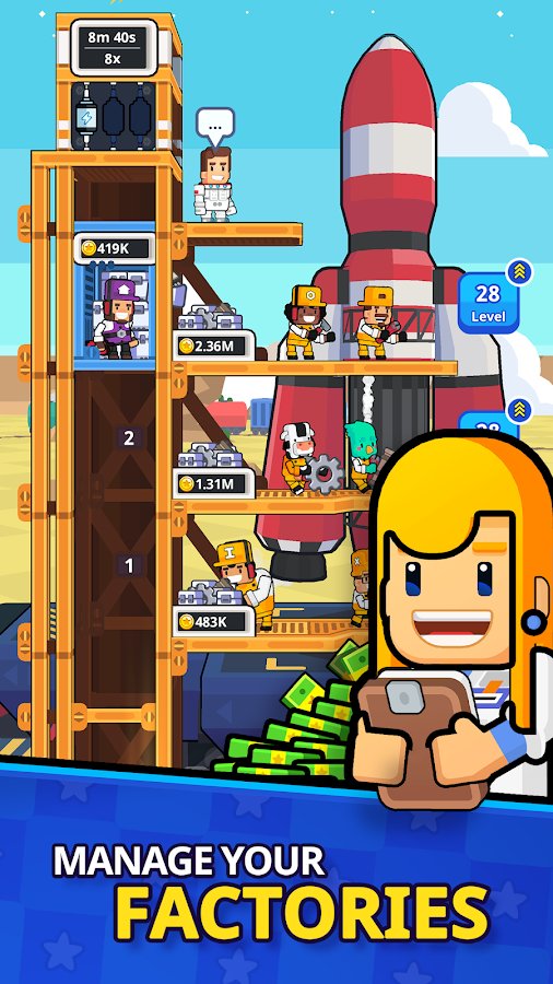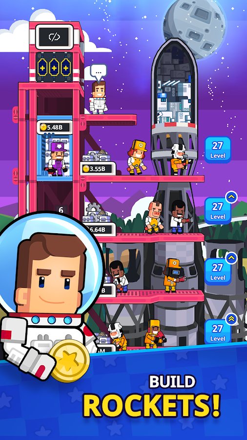 Rocket, Star - Idle Factory Space Tycoon Games – addictive economic strategy on Android where you control a rocket industry enterprise. In this game you will manage a huge plant and create missiles of various configurations. Create increasingly sophisticated missiles and earn money as well as run into space for various items. Accelerate the production of missiles and launch jets that will allow you to colonize other planets. Perform all the assigned missions of the game and become the richest man on the planet landing astronauts on the moon, Mars, Jupiter and other planets.