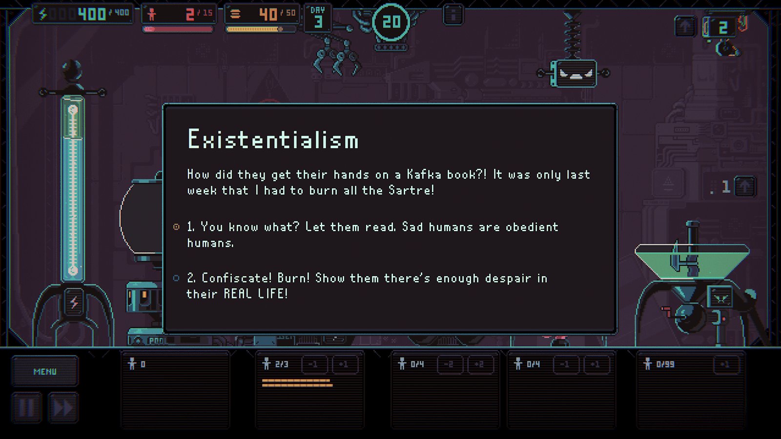 Despotism 3k – strategy game with elements of roguelike for Android, where you have to enslave humanity. In this game you are transported into an era where the world is ruled by AI and manipulates people that should get him the power. Build your vast Empire and ensure people were doing their job and not die from hunger and fatigue. Your main task in the game is the movement of people between the two buildings with a mechanical claw. In one building people have to rest, to multiply and to produce their own food, and in another - to produce energy, which is sorely lacking. The game will delight you with black humor, numerous missions and quests.