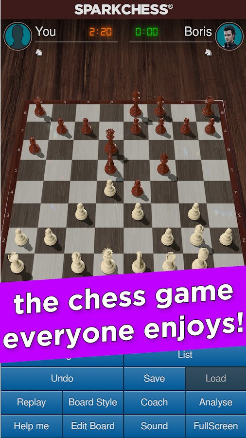SparkChess - chess for Android, which put on the first place fun. This game will help you learn to play chess, if you still don t know how. In addition, if you already have some experience in the game or are a professional, you will also be able to enjoy the time. All this thanks to different difficulty levels. There is also online multiplayer mode, so you can fight with a real person and not a bot.
