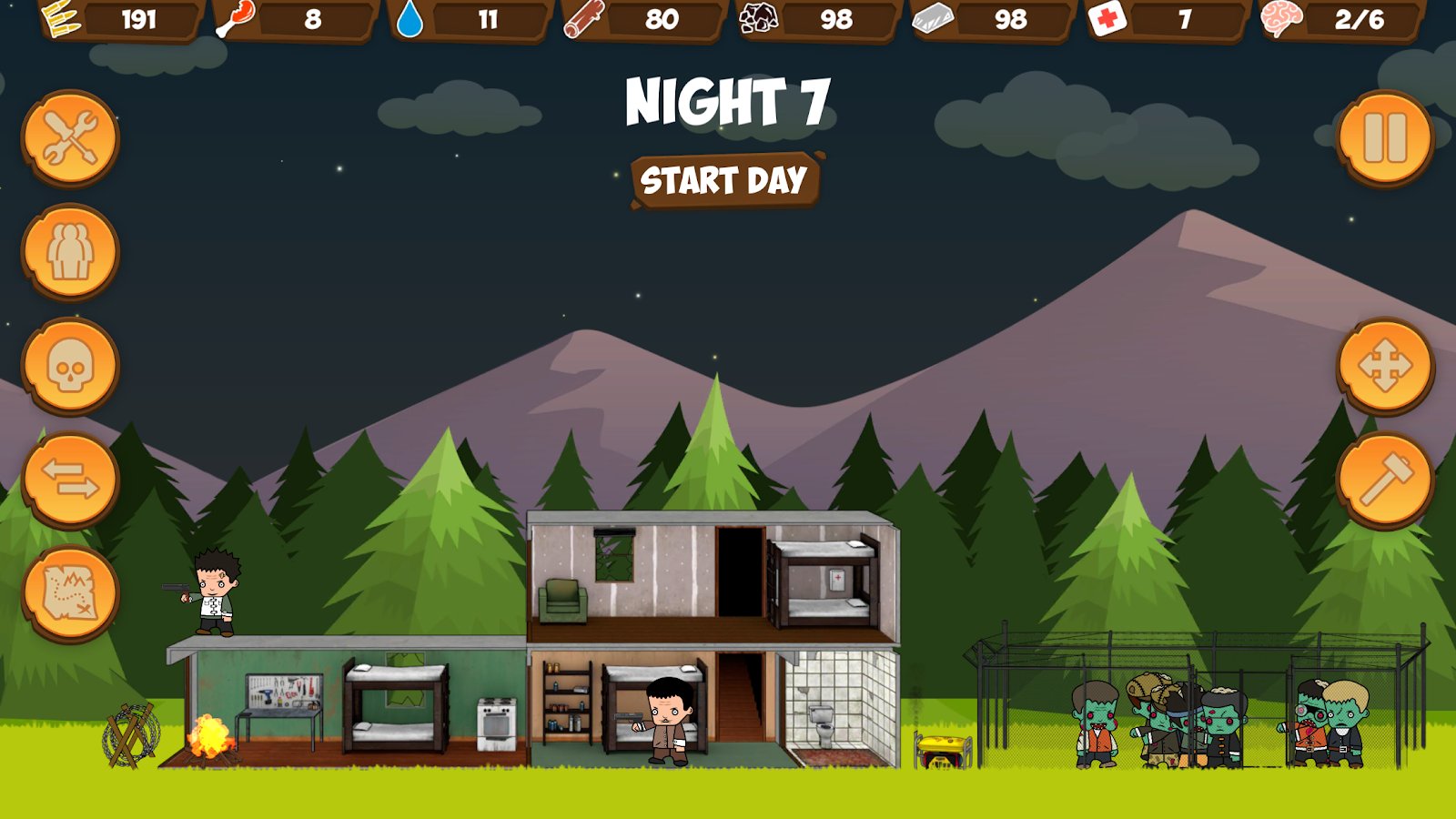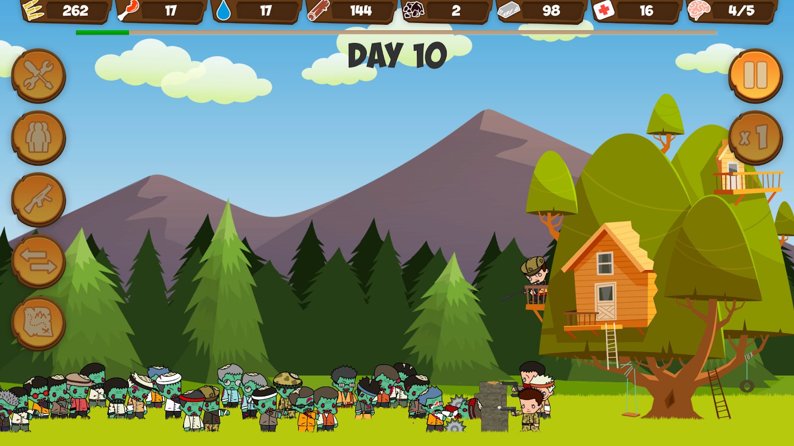 Zombie Forest HD: Survival – a fascinating strategy, where you survive in a world after a zombie Apocalypse. The zombie Apocalypse is in full swing, but to your luck you found refuge in the tree. Every day zombies are becoming more and eating less and now your task is to destroy the zombies and collect valuable stuff. Do the attacks from his refuge and looking for the same survivors, like you. Equip your team and search for more new partners. Set traps and snares for animals and collect rainwater. Build the barrier, as well as arrange the spikes and saw blades to kill zombies. Collect abandoned resources and supplies and try to avoid looters and other groups of survivors.