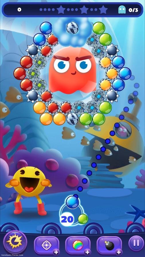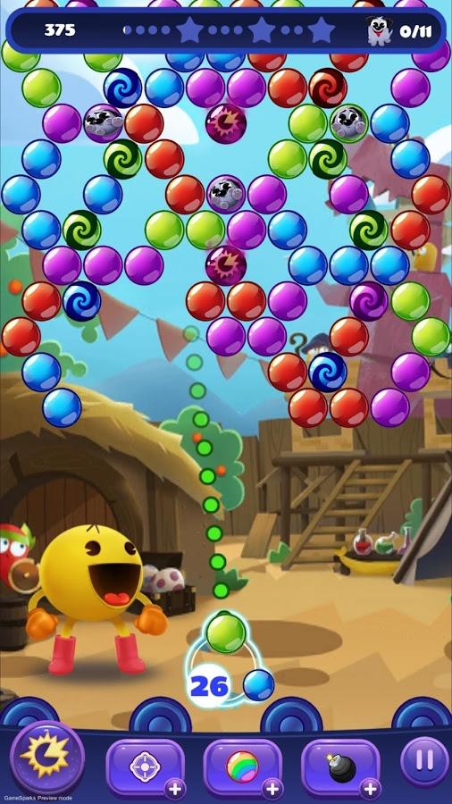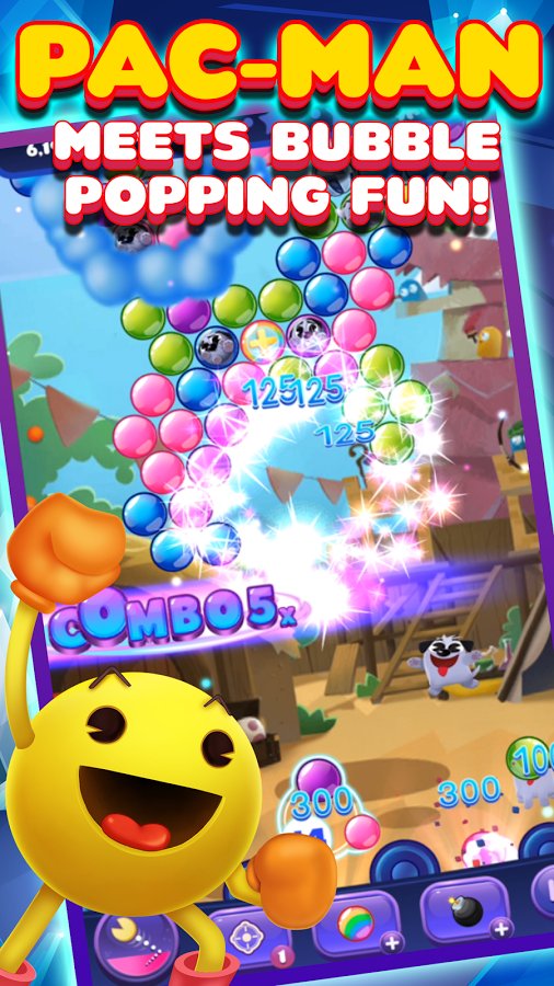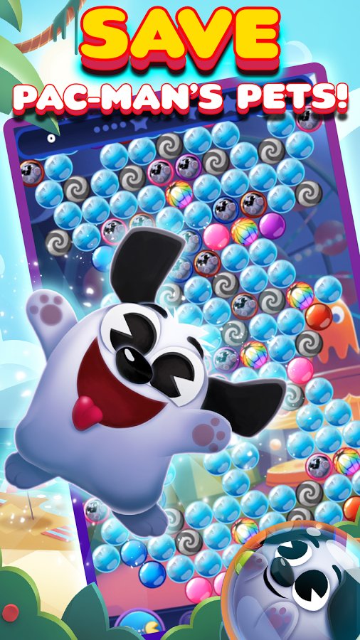 PAC-MAN Pop - Bubble Shooter – new game on Android where you will help the hero PAC-MAN to return all the fruit in PAC-Land. Arrogant the ghosts Inky, Blinky, Pinky and Clyde have replaced all the fruits and animals of the fairy world into the trap and now only our hero PAC-MAN can save them and bring them back. Shoot colorful bubbles into a cluster of them up there and clear the playing field of bubbles, while collecting the falling animals. Help the brave hero to PAC-man to collect all the Pets and rescue them from their ghosts. This fun game will delight you for many levels of their puzzles and brainteasers.